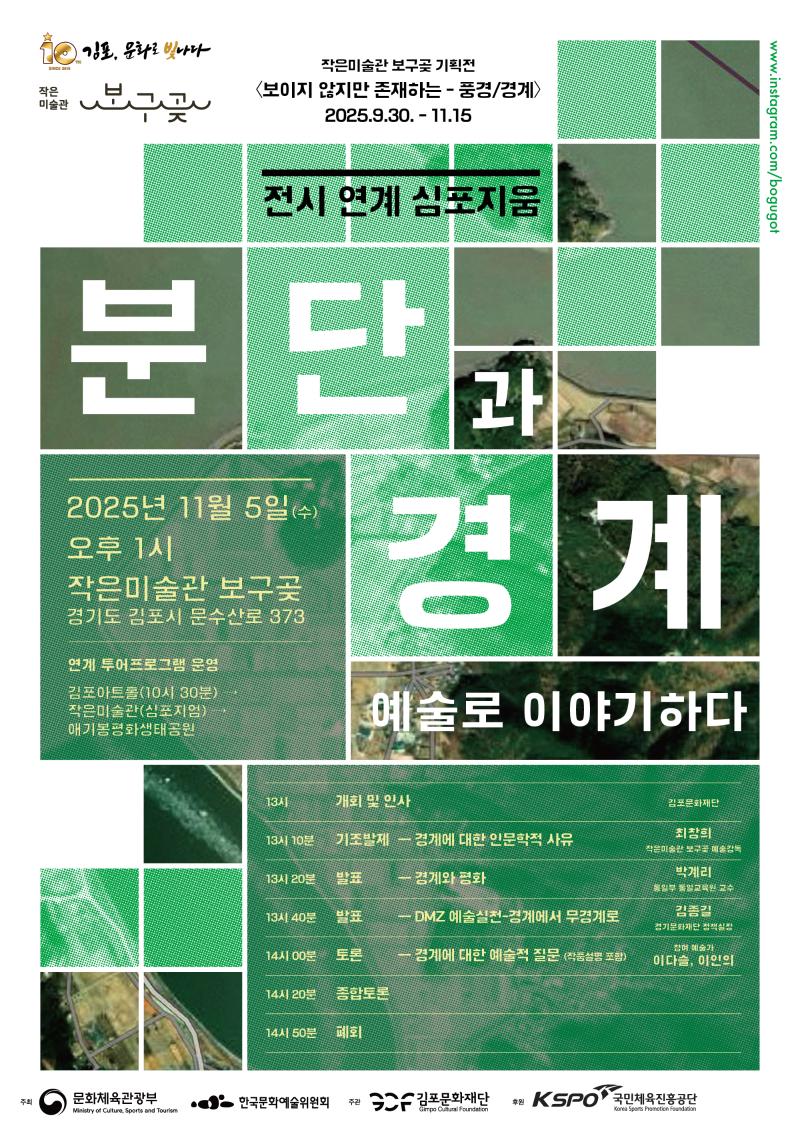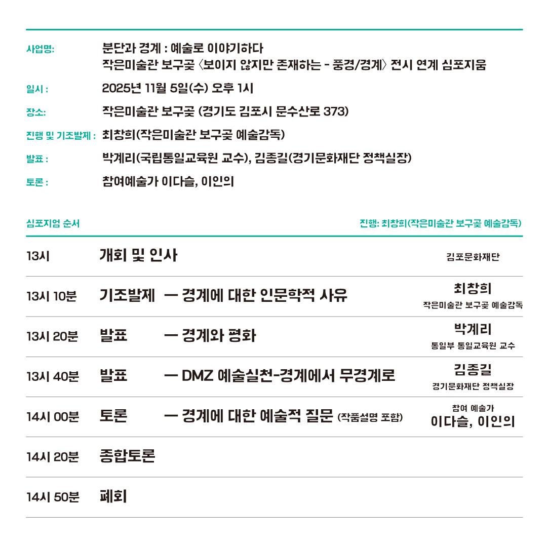 ※ <분단과 경계: 인문학과 예술로 이야기하다> 심포지엄만 참석하실 분은 개별로 작은미술관 보구곶으로 오시면 됩니다.