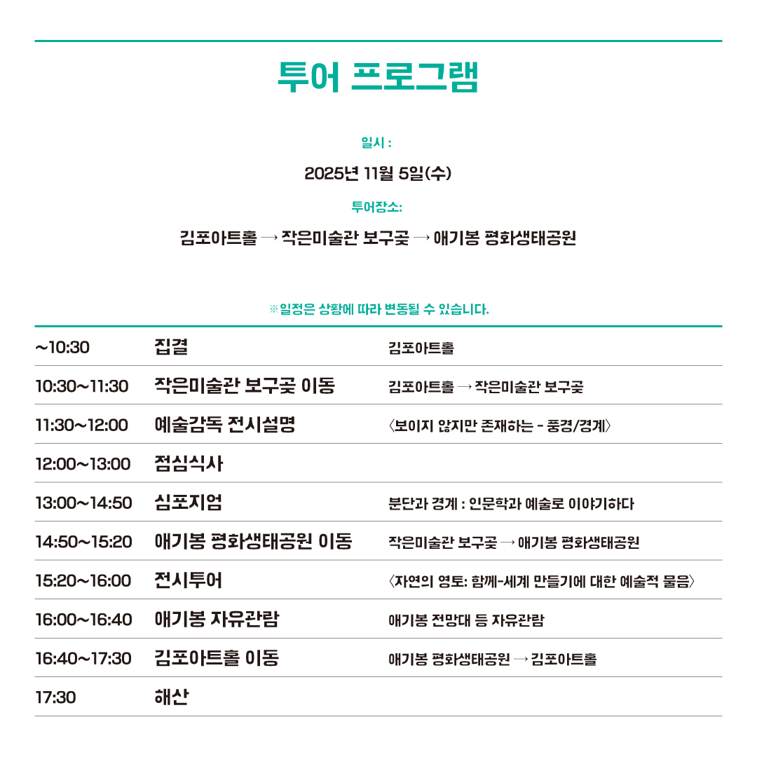 ※ 김포아트홀 - 작은미술관 보구곶 - 애기봉 평화생태공원까지 연결하는 투어프로그램에 참여하실 분은 투어프로그램을 신청해주세요