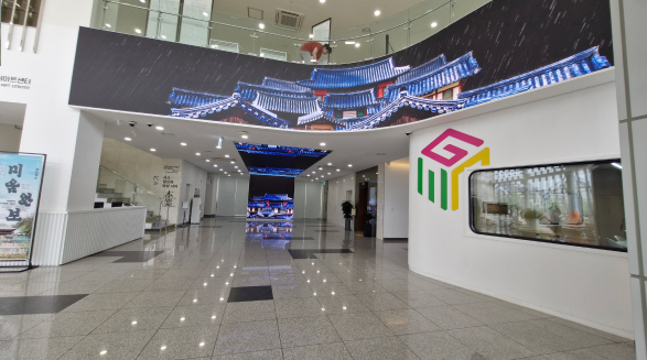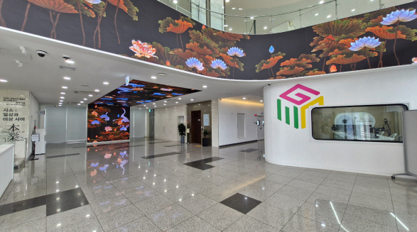1·2층으로 나눠진 2면 LED 디스플레이로 구현된 미디어월 공간입니다.