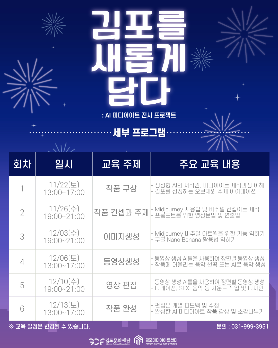 김포미디어아트센터에서는 인공지능(AI)을 활용한 미디어아트 창작 교육 「김포를 새롭게 담다: AI 미디어아트 전시 프로젝트」 참가자를 모집합니다.