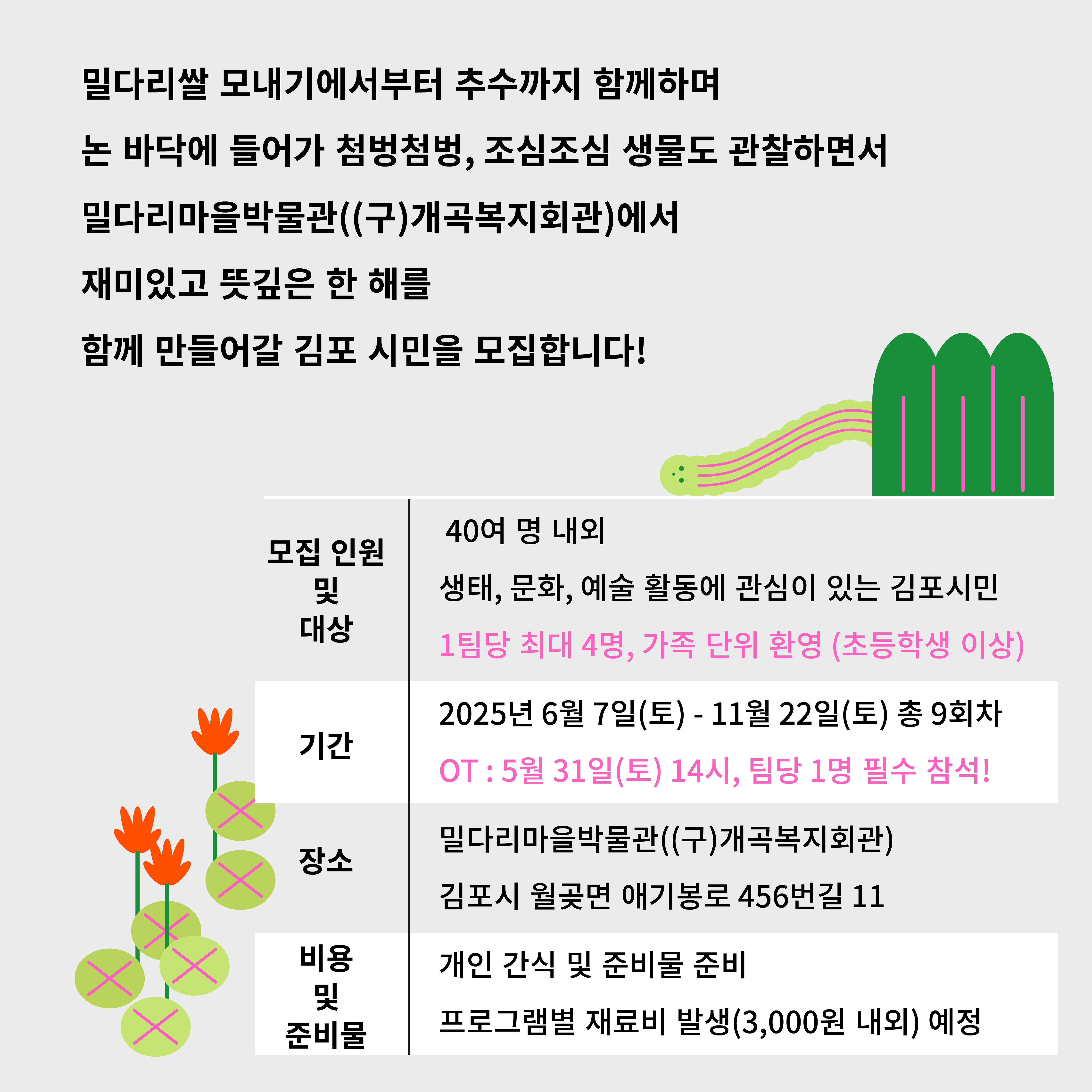 | 프로그램명 | 2025 싹트는 밀다리 Lab. <밀다리쌀을 키워라!> 2기연구원 모집 | ||