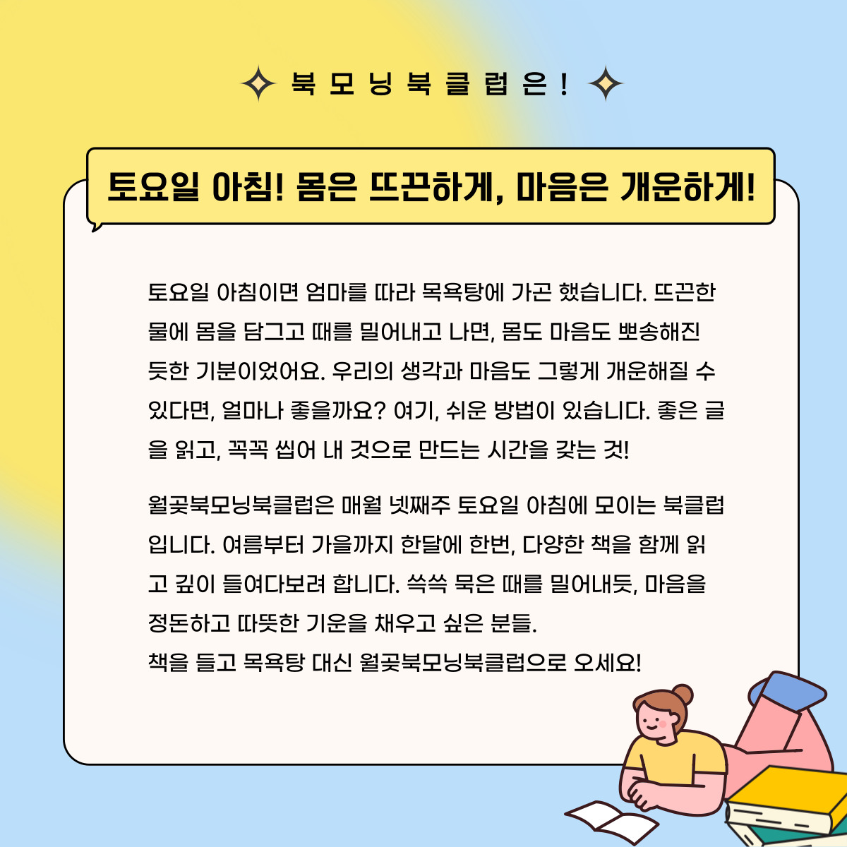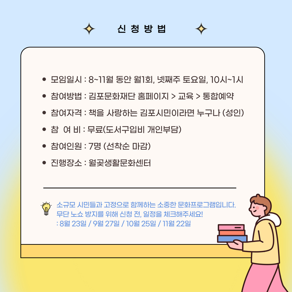 | 프로그램명 | 2025 월곶생활문화센터 [월곶북모닝클럽] 2기 참여자 모집 | ||