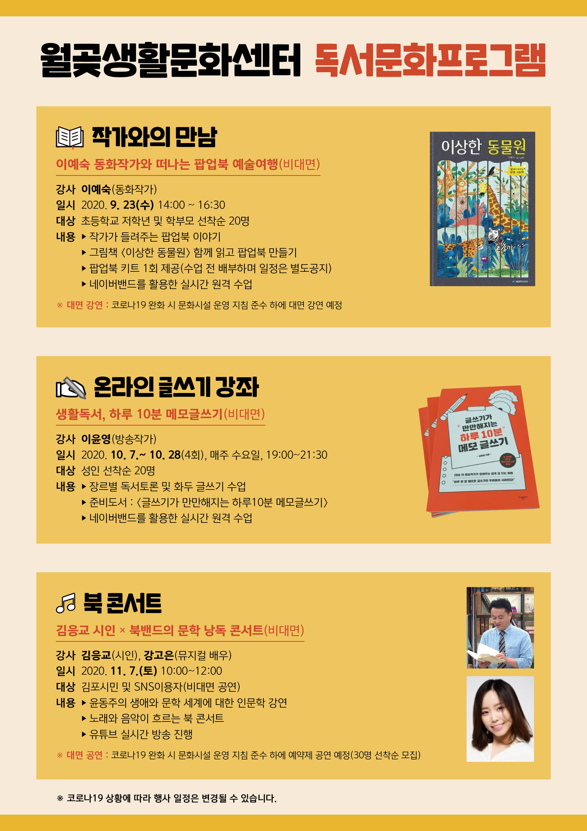 1.작가와의 만남: 이예숙 동화작가와 떠나는 팝업북 예술여행(비대면) 강사: 이예숙(동화작가) 일시: 2020.09.23수 14:00~16:30 대상: 초등학교 저학년 및 학부모 선착순 20명 내용: 작가가 들려주는 팝업북 이야기, 그림책(이상한 동물원)함께 읽고 팝업북 만들기, 팝업북 키트1회 제공(수업 전 배부하며 일정은 별도공지), 네이버밴드를 활용한 실시간 원격 수업 대면강연: 코로나 19완화 시 문화시설 운영 지침 준수 하에 대면 강연 예정 2.온라인글쓰기 강좌: 생활독서, 하루10분 메모글쓰기(비대면) 강사: 이윤영(방송작가) 일시: 2020.10.07~10.28(4회), 매주 수요일 19:00~21:30 대상: 성인 선착순 20명 내용: 장르별 독서토론 및 화두 글쓰기 수업, 준비도서:글쓰기가 만만해지는 하루 10분 메모글쓰기, 네이버밴드를 활용한 실시간 원격 수업 3.북콘서트:김응교시인x북밴드의 문학 낭독 콘서트(비대면) 강사: 김응교(시인), 강고은(뮤지컬배우) 일시: 2020.11.07 토 10:00~12:00 대상: 김포시민 및 SNS이용자(비대면공연) 내용: 윤동주의 생애와 문학 세계에 대한 인문학 강연, 노래와 음악이 흐르는 북 콘서트, 유튜브 실시간 방송 진행 대면공연: 코로나19 완화 시 문화시설 운영 지침 준수 하에 예약제 공연 예정(30명 선착순 모집) 코로나19상황에 따라 행사 일정은 변경될 수 있습니다.