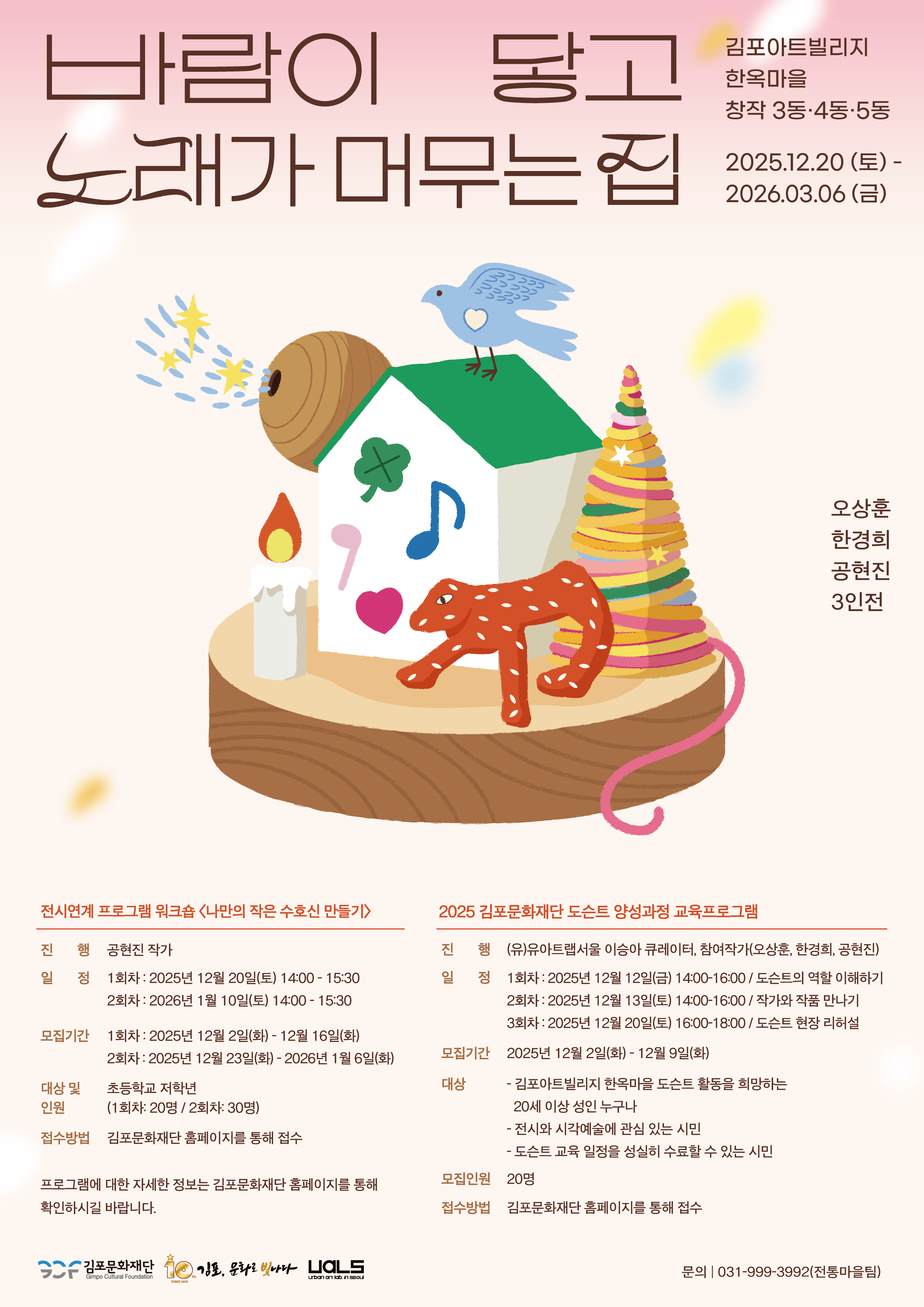 <바람이 닿고 노래가 머무는 집> 공현진 작가 워크숍 <나만의 수호신 만들기>1기, 2025 김포문화재단 도슨트양성교육프로그램 정원 신청 및 확정되어 접수 마감되었습니다.