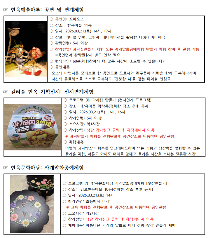 <한옥예술마루> 꼬마오즈: '과자만들기 체험, 자개압화공예체험 신청완료시 자동참가' ※공연관람만 원하시는 경우에도 오셔서 관람가능합니다.
