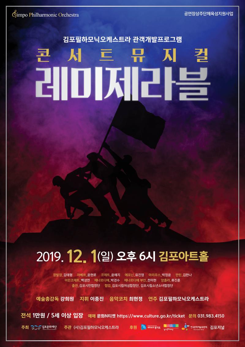 공연장상주단체 육성지원사업. 김포필하모닉오케스트라 관객개발프로그램. 콘서트 뮤지컬 레미제라블. 2019년 12월 1일 일요일 오후 6시 김포아트홀. 전설 1만원 5세 이상 입장. 예매 문화N티켓. 문의 031-983-4150