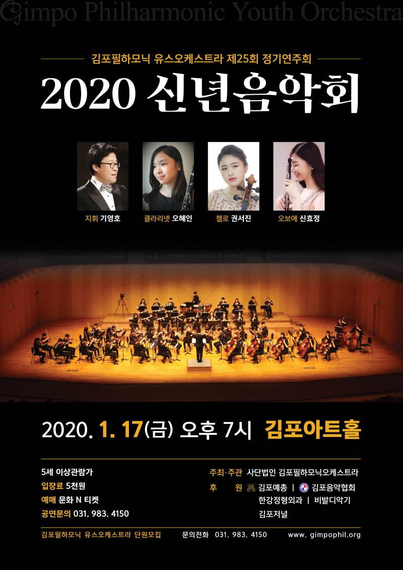 김포필하모닉 유스오케스트라 제25회 정기연주회 2020 신년음악회. 지휘 기영호. 클라리넷 오혜인. 첼로 권서진. 오보에 신효정. 2020년 1월 17일 금요일 오후 7시 김포아트홀. 5세이상관람가. 입장료 5천원. 예매 문화N티켓. 공연문의 031-983-4150. 주최주관 사단법인 김포필하모닉오케스트라. 후원 김포예총, 김포음악협회, 한강정형외과, 비발디악기, 김포저널.