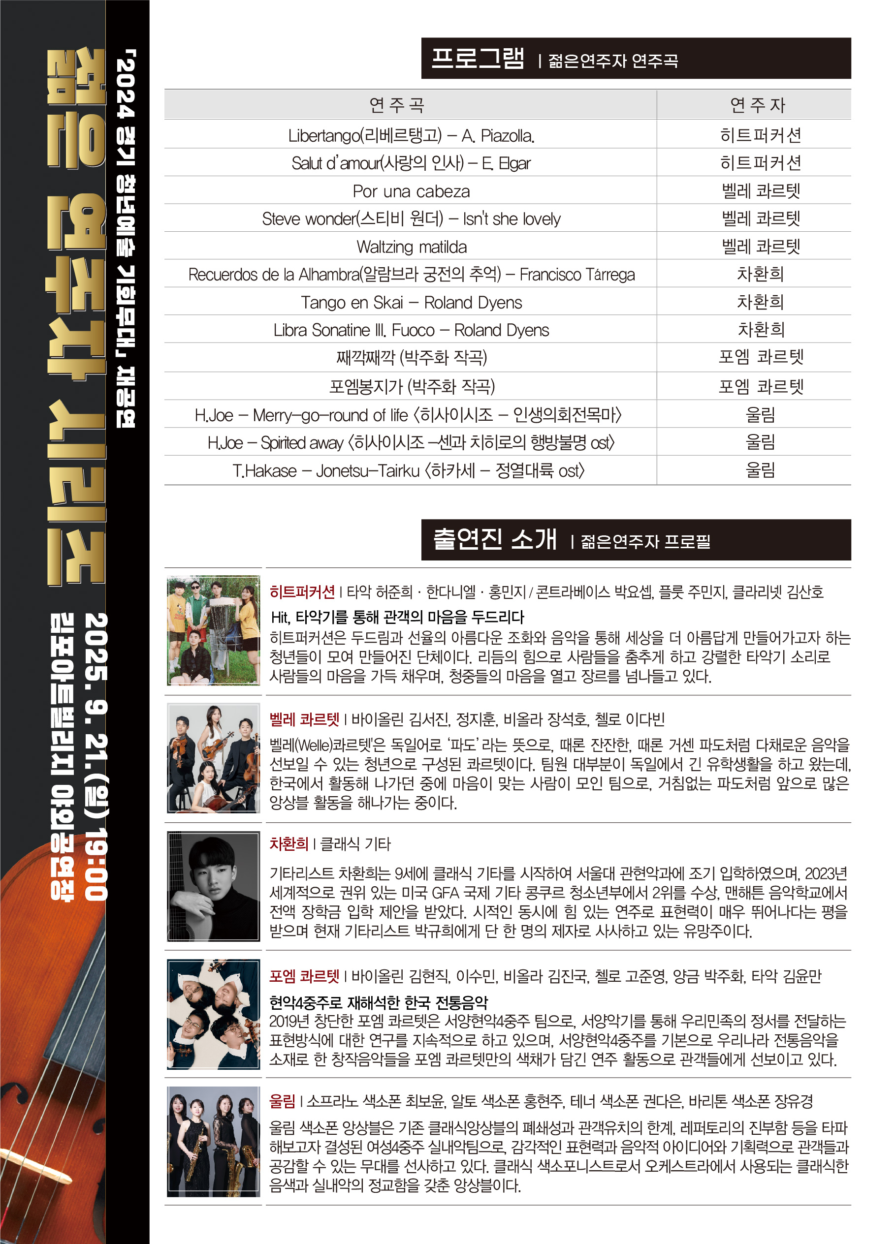 공연단체 : 총 5팀 (차환희, 포엠콰르텟, 히트퍼커션, 울림, 벨레 콰르텟)