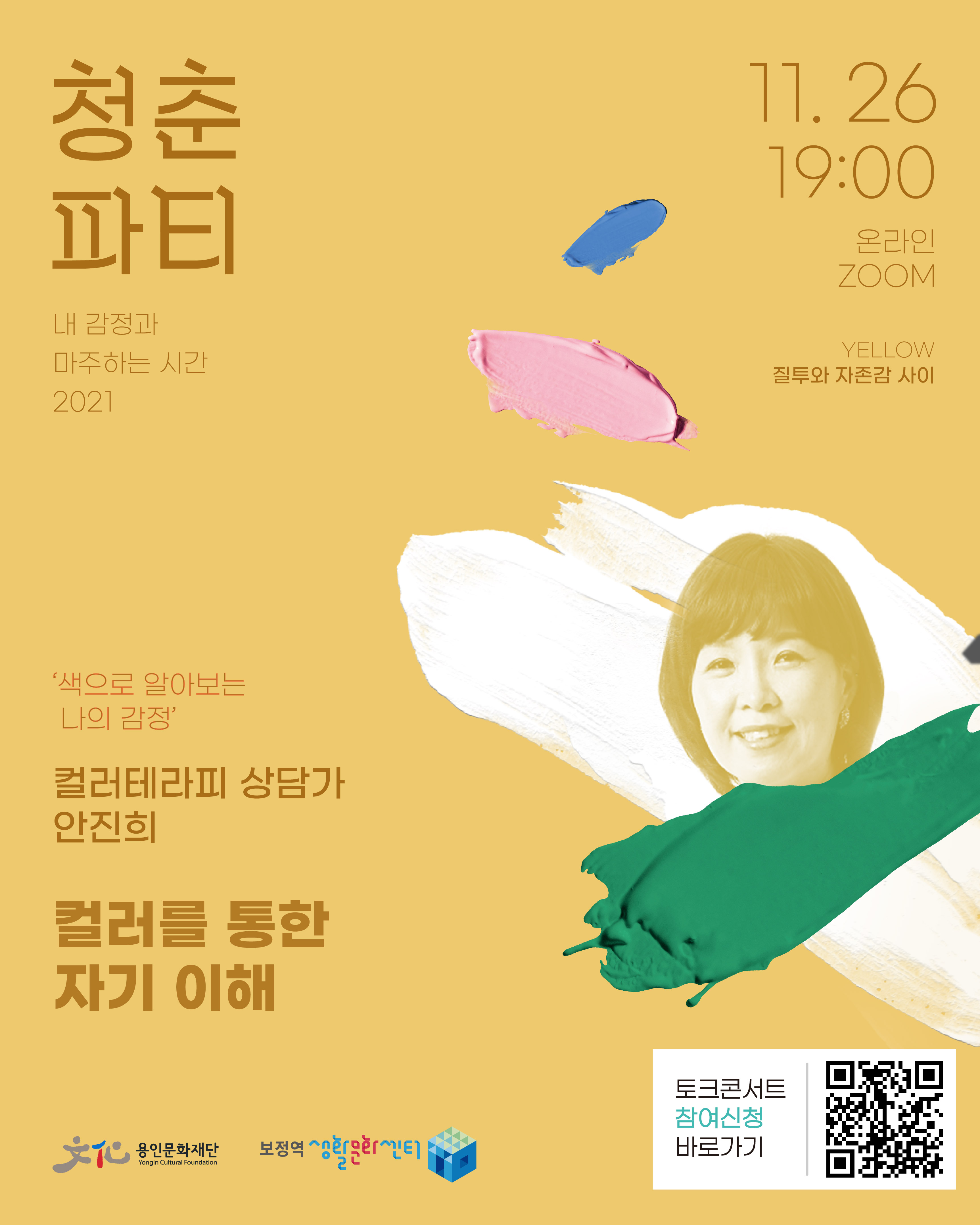 가. 건 명 : 2021 보정역 생활문화센터 <청춘파티> 11월 프로그램 나. 일시/장소 : 2021. 11. 26.(금) 19:00 / 온라인 플랫폼 ZOOM 다. 모집대상 : 만18세 ~ 39세 청년 ※ 용인시 관내 및 인근 거주 청년 우대 라. 신청방법 : 네이버 폼 내 양식 작성 (http://naver.me/xScVeLgF) 마. 주요내용 : 컬러테라피 상담가 안진희 초청, 자기 이해를 테마로 한 토크 콘서트 진행 ![]() |