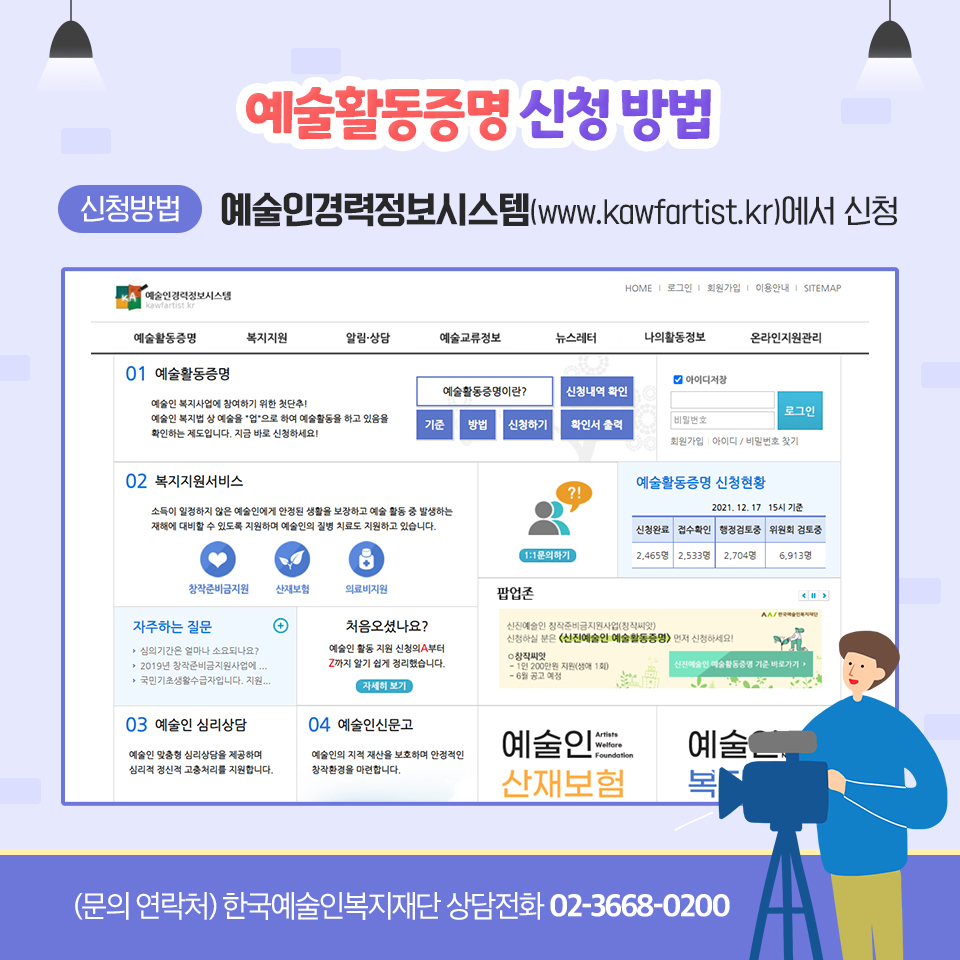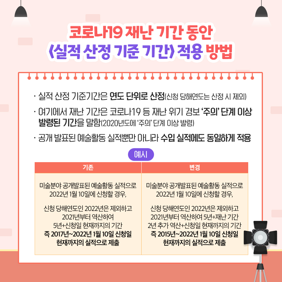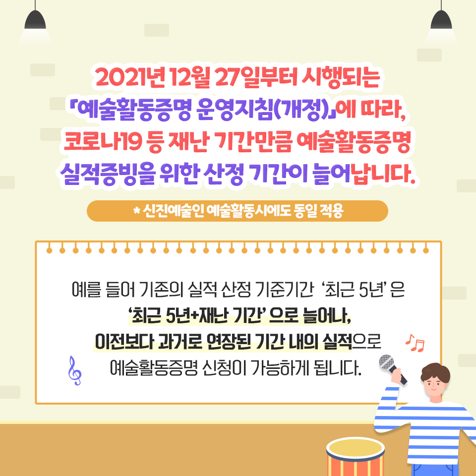 문화체육관광부 | 예술활동증명 운영지침 개정 문화체육관광부와 한국예술인복지재단에서는 코로나19의 장기화로 어려움을 겪는 예술인들이 예술활동증명을 보다 더 수월하게 받아 예술인복지제도에 참여할 수 있도록 '예술활동증명 운영지침'을 개정하였고, 동 지침은 2021년 12월 27일자로 시행됩니다. 가. 예술활동증명 개요 1) 목적: 예술인의 직업적 지위와 권리를 법적으로 보호하기 위해 예술인 복지법 상 예술활동을 업(業)으로 하고 있음을 확인하는 제도 2) 내용: 공개발표된 예술활동, 활동 수입 등 예술분야의 기준별 자료 제출 및 심의 * 예시) 최근 5년 간 5편의 작품 전시, 최근 3년 간 3편의 연극 공연 나. 개정 사항 - 코로나 19 등 재난기간 만큼 예술활동증명 실적증빙을 위한 기간 연장 * 예시) 기존의 실적기간인 '최근 3년'은 '최근 3년+재난기간'으로 늘어나, 이전보다 과거로 연장된 기간 내의 실적으로 예술활동증명 신청이 가능 - 신진예술인 예술 활동 증명에도 동일하게 적용 다. 문의 : 한국예술인복지재단 상담전화(02-3668-0200) ![]() ![]() ![]() ![]() ![]() ![]() |