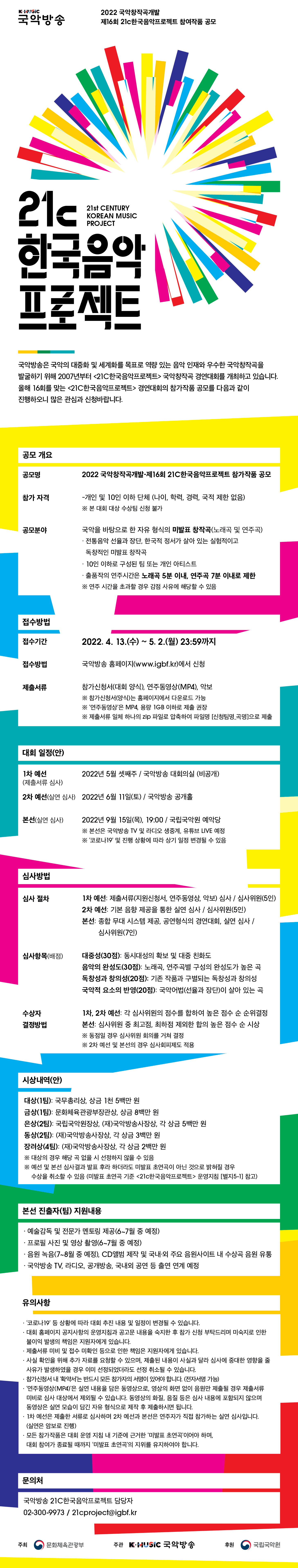 재단법인 국악방송 | '2022 제16회 21c한국음악프로젝트' 참가작품 공모 대회 개요 ㅇ 대 회 명 : 2022 국악창작곡개발-제16회 21c한국음악프로젝트 ㅇ 대회목적 : 참신하고 독창적인 국악창작곡 개발, 역량있는 음악 인재 발굴 및 지원 ㅇ 대회일정 - 참가접수 : 2022년 4월 13일(수)~5월 2일(월) *국악방송 홈페이지 신청 - 1차 예선 : 2022년 5월 중순 / 국악방송 - 2차 예선 : 2022년 6월 11일(토) / 국악방송 - 본 선 : 2022년 9월 15일(목), 19:00 / 국립국악원 예악당 (TV, 라디오, 온라인 생중계) ※ 진행 상황에 따라 일부 일정 변경될 수 있음 ㅇ 주요내용 : 국악창작곡 경연 대회 개최, 전문가 멘토링, 수상곡 음원녹음 및 온라인 유통, 방송 출연 등 ㅇ 총 상금 : 4,700만원 (대상 1팀, 금상 1팀, 은상 2팀, 동상 2팀, 장려상 4팀) ㅇ 주 최 : 문화체육관광부 ㅇ 주 관 : (재)국악방송 ㅇ 후 원 : 국립국악원 ㅇ 문 의 : 국악방송 미디어사업부 21c한국음악프로젝트 담당자 (02-300-9973, jinsaem@igbf.kr)