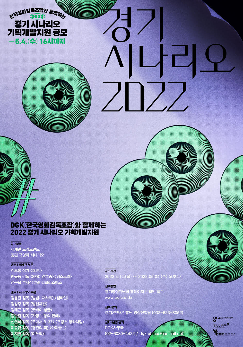 경기콘텐츠진흥원 | 2022년 경기 시나리오 기획개발지원 사업 공고 가. 사 업 명 : 경기 시나리오 기획개발지원 나. 주 관 : 경기콘텐츠진흥원 다. 지원내용 : 세계관 트리트먼트·장편극영화 시나리오 개발지원 라. 신청자격 : 시나리오 작가(기성, 신인 무관) 마. 공모분야 : 세계관 부문, 시나리오 부문 바. 접수기간 : ~ 2022. 05. 04.(수) 16:00 까지 사. 접수방법 : 경기영상위원회 홈페이지 온라인 접수 - 양식다운로드 : www.gcon.or.kr(경기콘텐츠진흥원), www.ggfc.or.kr(경기영상위원회) 아. 문의사항 : 경기콘텐츠진흥원 방송영상산업팀 032-623-8052 ※ 세부 내용은 경기영상위원회 홈페이지(www.ggfc.or.kr)로 방문 바랍니다. ![]() |