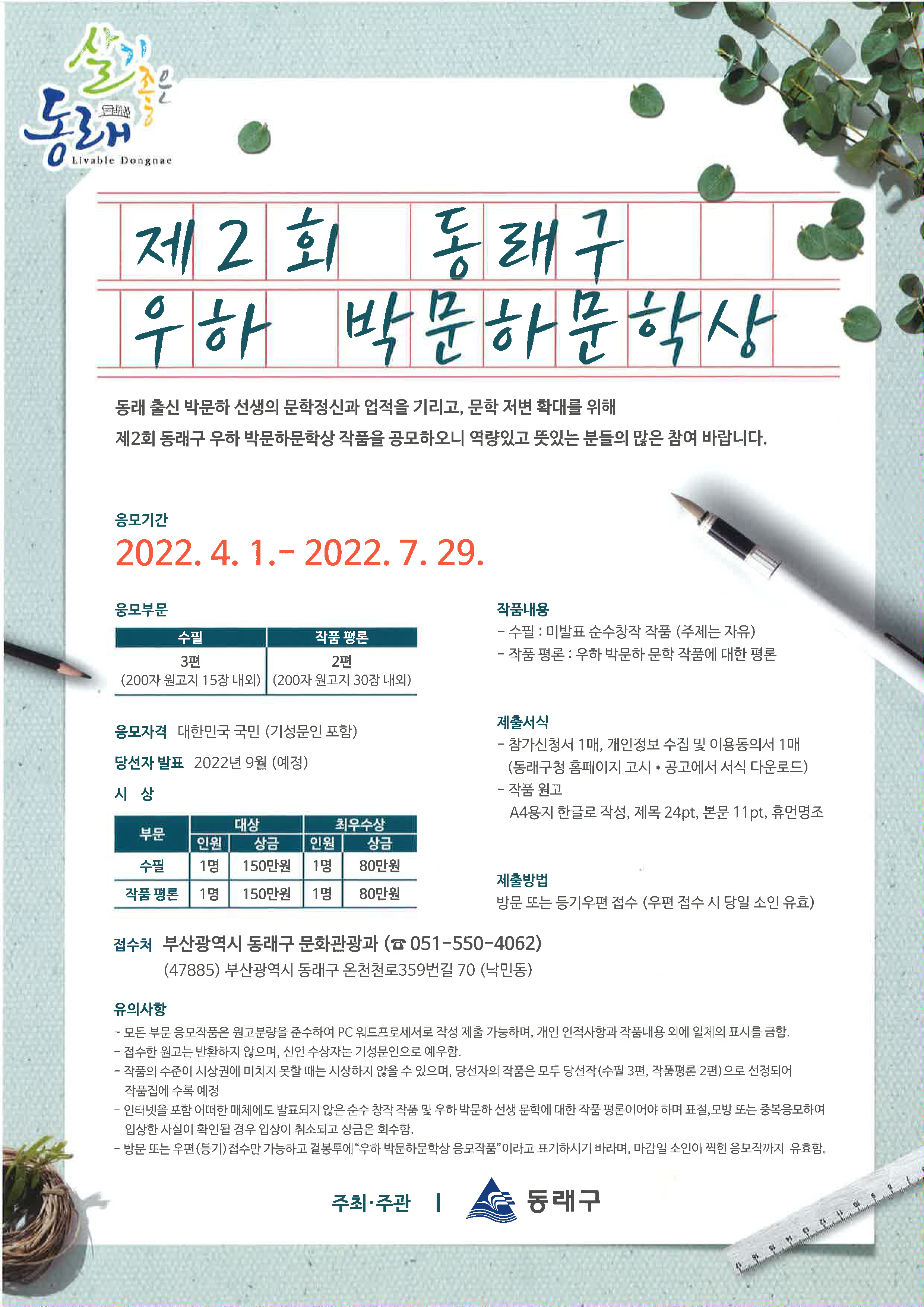 | 첨부 | 제2회 동래구 우하 박문하문학상 공모 공고문.hwp 다운로드 | ||