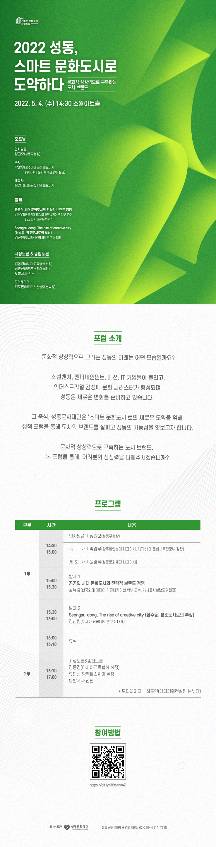 성동문화재단 | <스마트 문화도시 성동 정책포럼> 개최 가. 개 요 1) 포럼명: 2022 성동, 스마트 문화도시로 도약하다 - ‘문화적 상상력으로 구축하는 도시 브랜드’ 2) 일 시: 2022. 05. 04.(수) 14:30~17:00 3) 장 소: 소월아트홀 4) 내 용: 공공의 시대 문화도시의 전략적 브랜드와 창의도시로 부상하는 성수동의 사례를 통한 지속 가능한 도시 브랜드 구축 방안 모색 나. 신청 및 문의 1) 신 청: 사전 온라인 신청(https://bit.ly/36nwmAZ) 2) 문 의: (재)성동문화재단 경영지원실(02-2204-7511/rupitimint@sdfac.or.kr) ![]() |