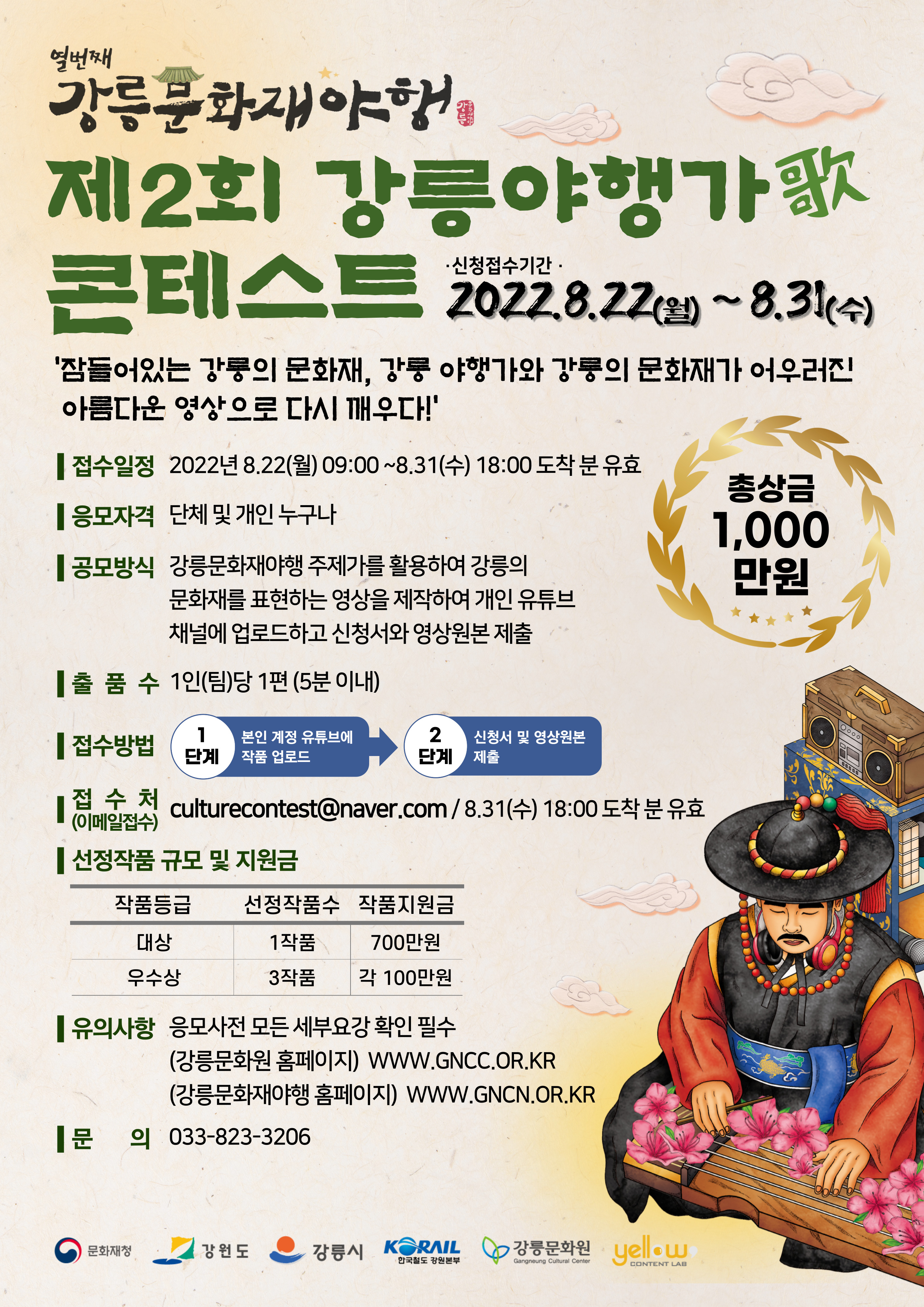 <행사안내> 가. 사 업 명 : 2022 강릉문화재야행(夜行) 강릉 야행가(歌) 콘테스트 나. 주요내용 : 강릉문화재야행 주제가를 바탕으로 강릉의 문화재를 표현하는 영상 콘테스트 다. 총 상 금 : 1,000만원(최고액 700만원) 라. 지원자격 : 개인 및 단체 누구나 마. 접수기간 : 2022. 08. 22(월) 09:-00~ 08.31.(수) 18:00 바. 문 의 : 033-823-3206 ![]() |