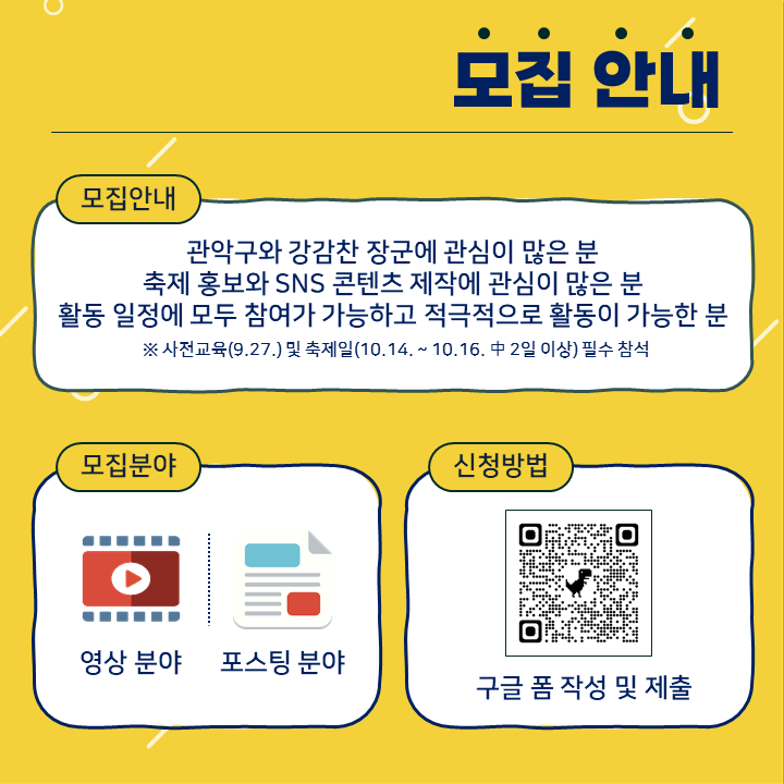 <모집개요> 1) 공 고 명 : 「2022관악강감찬축제 서포터즈」모집 2) 접수기간 : 2022. 9. 8.(목) ~ 9. 23.(금) 3) 분야/인원 : 축제 사전·현장·사후 홍보 / 총 25명 내외 4) 모집대상 - 관악구와 강감찬 장군에 대해 관심이 많은 분 - 축제 홍보와 SNS 콘텐츠 제작에 관심이 많은 분 - 활동 일정에 모두 참여가 가능하고 적극적으로 활동이 가능한 분 ※ 사전교육(9.27.) 및 축제일(10.14. ~ 10.16. 中 2일 이상) 필수 참석 5) 접수방법 : 구글 폼 통하여 신청 ( URL링크: (https://forms.gle/raB4q7tKT3wESejdA)) ![]() ![]() ![]() |