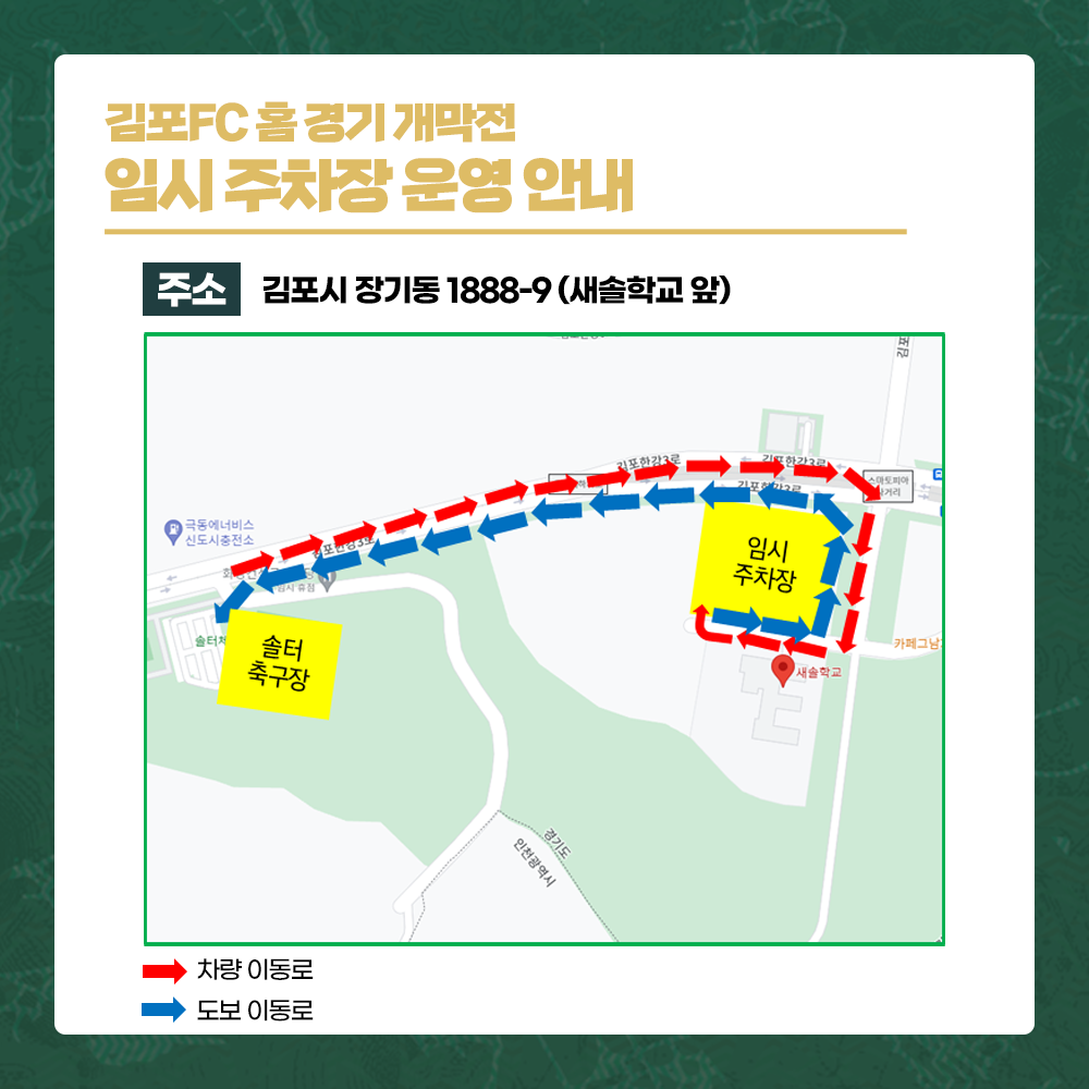 김포FC 프로리그(K리그2) 홈 개막전 개최 안내 [개막전 개요] 1) 행 사 명 : 김포FC 솔터축구장 홈 개막전(좌석 : 5,000석) 2) 경기일시 : 2023. 3. 5(일) 13:30 ∼ 3) 경기장소 : 마산동 솔터축구장(김포시 김포한강3로 385) 4) 주요내용 : 개막식 및 축구경기(김포FC VS 천안시티FC) 5) 티켓구매 : 인터넷 예매(http://www.ticketlink.co.kr) 및 현장구매 ※ 인터넷 예매는 2월 26일 11시부터 가능합니다. |