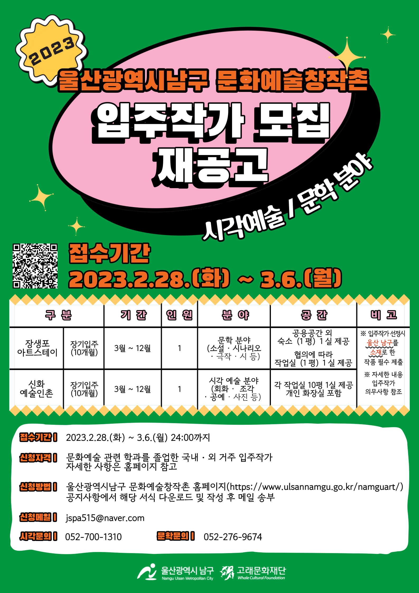2023 문화예술창작촌 레지던시 입주작가 모집 재공고 안내 <공모개요> 1) 공 고 명 : 2023 울산광역시남구 문화예술창작촌 레지던시 입주작가 모집 재공고 2) 접수기간 : 2023. 2. 28. (화) ~ 3. 6.(월) 24:00까지 3) 모집분야 : 시각예술분야 및 문학 분야 4) 공모대상 : 모집 공고일 기준 만19세 이상 국·내외 거주 작가 ※ 자세한 내용은 ‘울산광역시남구 문화예술창작촌’홈페이지 및 재공고 모집요강 확인 5) 접수방법 : ‘울산광역시남구 문화예술창작촌’ 홈페이지에서 양식 다운로드 후 문화예술창작촌 메일(jspa515@naver.com)로 제출 |