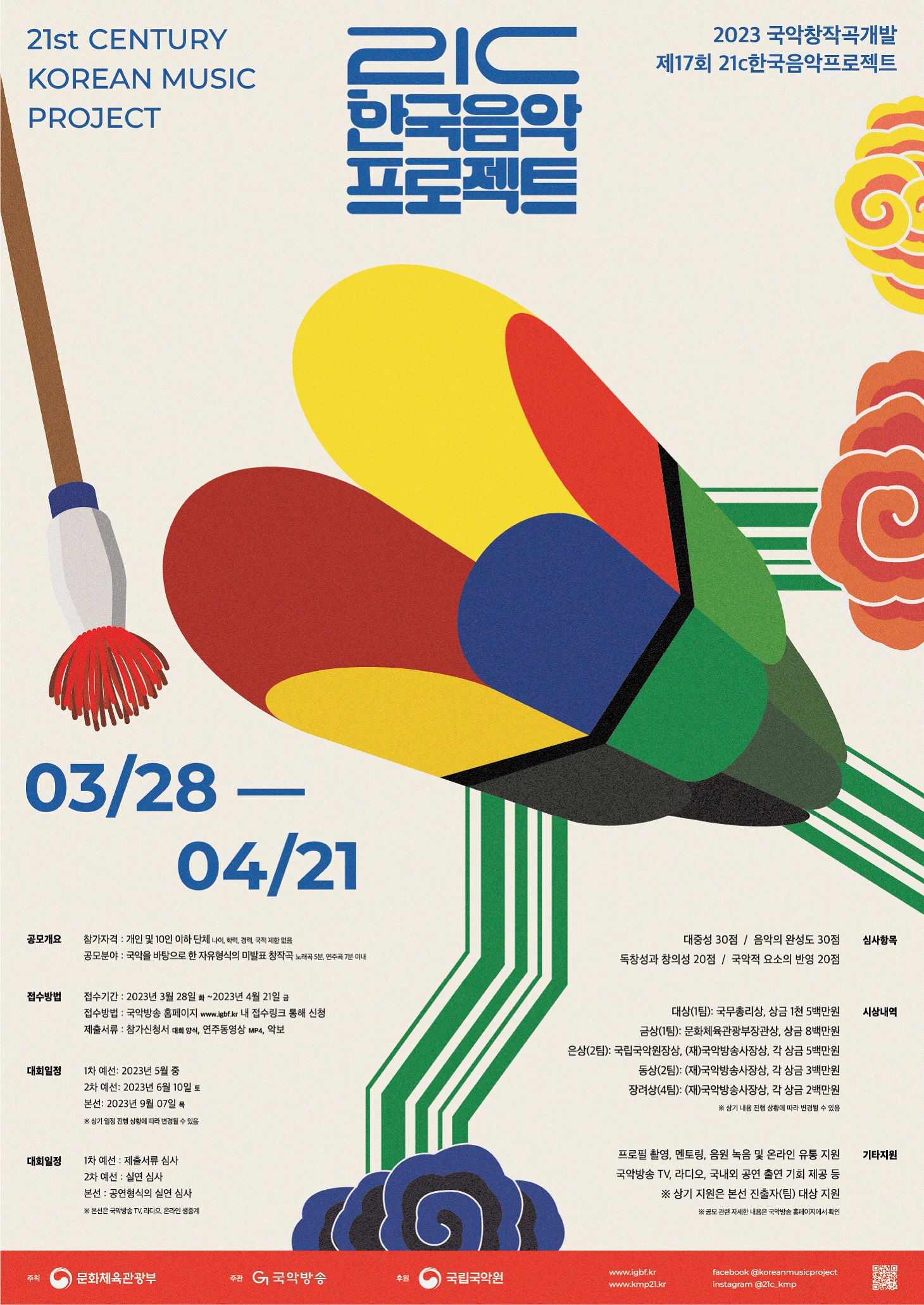 <대회 개요> 1) 대 회 명 : 2023 국악창작곡개발-제17회 21c한국음악프로젝트 2) 대회목적 : 참신하고 독창적인 국악창작곡 개발, 역량있는 음악 인재 발굴 및 지원 3) 대회일정 - 참가접수 : 2023년 3월 28일(화)~4월 21일(금) *국악방송 홈페이지 내 접수링크 통해 신청 - 1차 예선 : 2023년 5월 초 / 국악방송 - 2차 예선 : 2023년 6월 10일(토) / 국악방송 - 본 선 : 2023년 9월 7일(목), 19:00 / 국립국악원 예악당 (TV, 라디오, 온라인 생중계) ※ 진행 상황에 따라 일부 일정 변경될 수 있음 4) 주요내용 : 국악창작곡 경연 대회 개최, 전문가 멘토링, 수상곡 음원녹음 및 온라인 유통, 방송 출연 등 5) 총 상금 : 4,700만원 (대상 1팀, 금상 1팀, 은상 2팀, 동상 2팀, 장려상 4팀) 6) 주 최 : 문화체육관광부 7) 주 관 : (재)국악방송 8) 후 원 : 국립국악 9) 문 의 : 국악방송 미디어사업부 21c한국음악프로젝트 담당자 (02-300-9973, eunseokim96@igbf.kr)