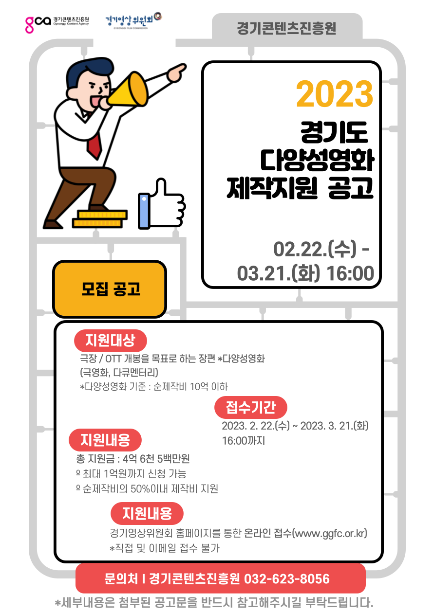 <사업개요> 1) 주 관 : 경기콘텐츠진흥원(경기영상위원회) 2) 지원내용 : 국내 장편 다양성영화 제작비 지원(순제작비 50% 이내, 최대 1억원까지) 3) 지원대상 : 극장 또는 OTT 개봉을 목표로 하는 장편 독립영화 4) 모집분야 : 극영화 부문(장르불문/경기도배경영화), 다큐멘터리 부문 5) 접수기간 : ~ 2023. 03. 21.(화) 16:00 까지 6) 접수방법 : 경기영상위원회 홈페이지 온라인 접수 ※ 양식다운로드 : www.gcon.or.kr(경기콘텐츠진흥원), www.ggfc.or.kr(경기영상위원회) 7) 협조사항 : 사업 포스터 및 공고문 홍보 8) 문의사항 : 경기콘텐츠진흥원 영상산업팀 032-623-8056 ※ 사업에 대한 자세한 내용은 경기영상위원회 홈페이지(www.ggfc.or.kr)에서 확인 가능