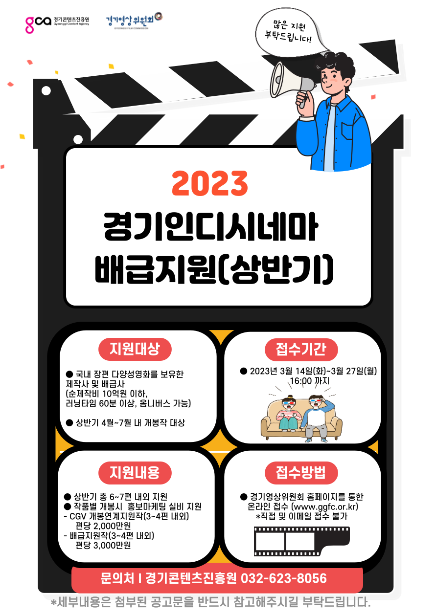 <사업개요> 1) 사 업 명 : 2023 경기인디시네마 배급지원 2) 주 관 : 경기콘텐츠진흥원(경기영상위원회) 3) 지원내용 : 국내 장편 다양성영화 개봉 시 온,오프라인 홍보마케팅 실비지원 4) 지원대상 : 국내 장편 다양성영화를 보유한 제작사 또는 배급사 5) 모집분야 : 국내 장편 다양성영화 미개봉작(연내 4~7월 이내 개봉예정작) 6) 접수기간 : ~ 2023. 03. 27.(월) 16:00 까지 7) 접수방법 : 경기영상위원회 홈페이지 온라인 접수 ※ 양식다운로드 : www.gcon.or.kr(경기콘텐츠진흥원), www.ggfc.or.kr(경기영상위원회) 8) 협조사항 : 사업 포스터 및 공고문 홍보 9) 문의사항 : 경기콘텐츠진흥원 영상산업팀 032-623-8056 ※ 사업에 대한 자세한 내용은 경기영상위원회 홈페이지(www.ggfc.or.kr)에서 확인 가능 |