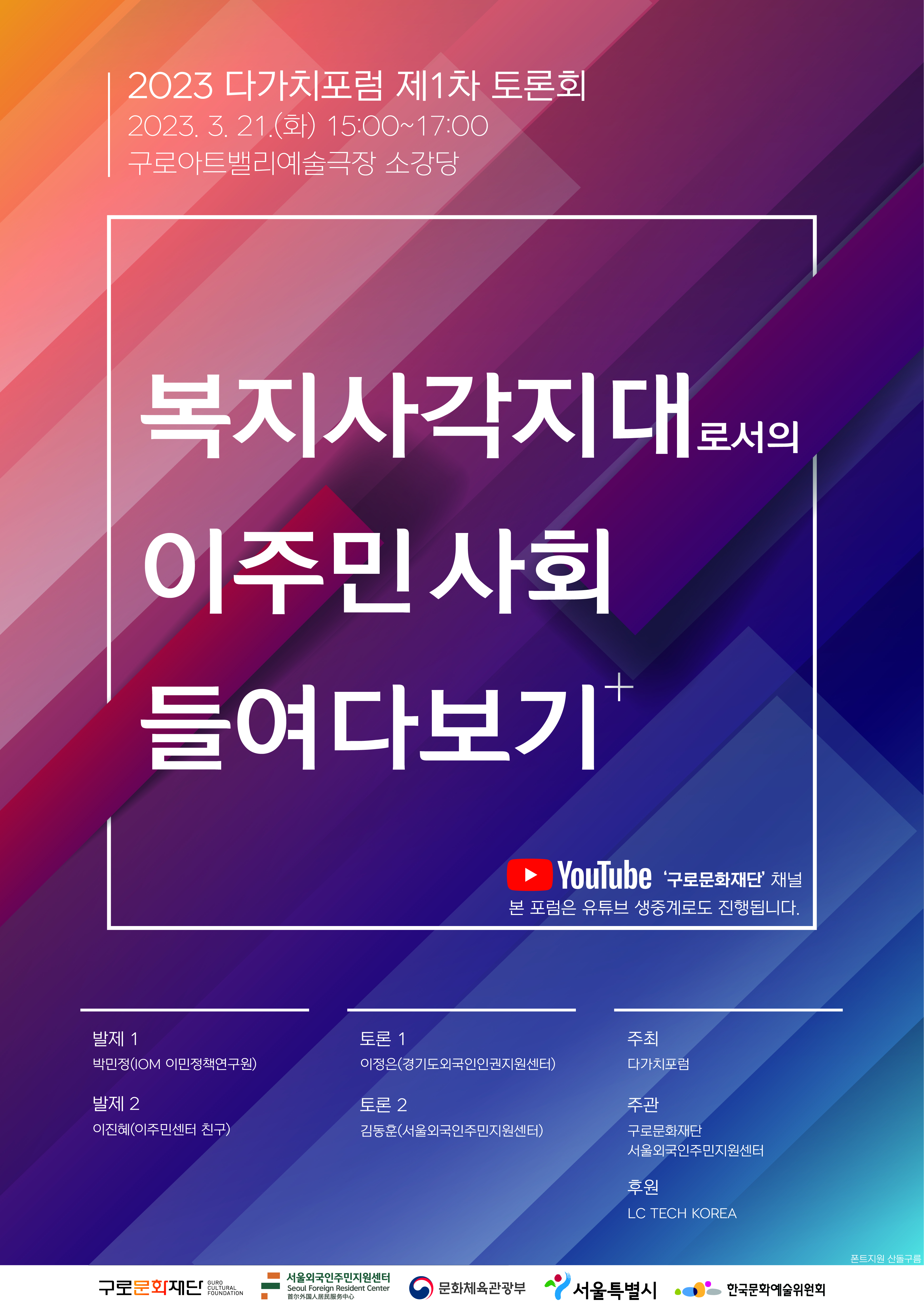 <행사 개요> 1) 행사명 : 2023년도 다(多)가치포럼 제1차 토론회 2) 주 제 : 복지사각지대로서의 이주민사회 들여다보기 3) 일 시 : 2023년 3월 21일 15시, 세계 인종차별 철폐의 날 4) 장 소 - 오프라인 : 구로아트밸리예술극장 소강당(서울시 구로구 가마산로25길 9-24) - 온 라 인 : 유튜브 채널‘구로문화재단’ youtu.be/DxhUNphj7Vw 5) 행사내용