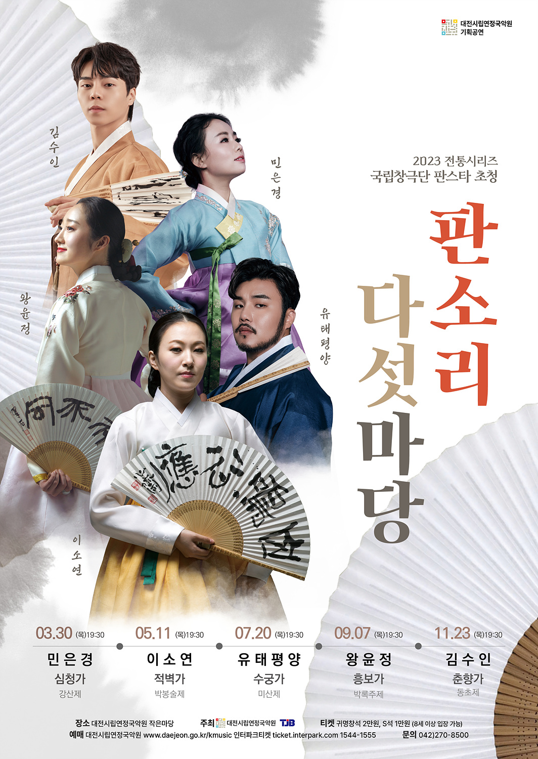 <공연 개요> 1) 공연명: 대전시립연정국악원 2023전통시리즈 [국립창극단 판스타 초청, 판소리 다섯 마당] 2) 공연내용, 일시: - 3. 30(목) 민은경/심청가 - 5. 11(목) 이소연/적벽가 - 7. 20(목) 유태평양/수궁가 - 9. 07(목) 왕윤정/흥보가 - 11. 23(목) 김수인/춘향가 오후 7시 30분 ※ 공연 상세 내용은 대전시립연정국악원 홈페이지 참고 바람(url.kr/1ho7z9) 3) 공연장소: 대전시립연정국악원 작은마당
