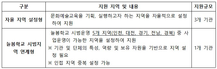 2023 매개자 협력 학교 문화예술교육 지원사업 「예술로 링크(Link)」 공모 안내 <사업개요> 1) 사 업 명: 2023 매개자 협력 학교 문화예술교육 지원사업 ‘예술로 링크(Link)’ 2) 사업기간: 2023년 3월 ~ 12월 3) 사업내용 - 문화예술교육 전문인력 역할 전환 및 활동 영역 확대 지원 - 학습자 중심의 학교 수요 맞춤형 문화예술교육 프로젝트 실현 지원 - 지역 자원 연계 및 학습자 중심의 수요 맞춤형 방과후, 돌봄 문화예술교육 프로젝트 지원 <공모개요> 1) 공 모 명: 2023 매개자 협력 학교 문화예술교육 지원사업 ‘예술로 링크(Link)’ 매개기관 공모 2) 공모기간: 공고일로부터 ~ 2023. 4. 14.(금) 15:00까지 3) 공모대상: 매개자 협력을 통한 학교-지역 연계 문화예술교육 기획, 운영 역량을 갖춘 기초지역 단위(시,군,구) 기관, 민간단체 4) 지원규모: 총 4개 기관 선정 예정(기관당 100백만원 정액 지원) - 자율 지역 설정 3개 기관, 늘봄학교 연계 1개 기관 5) 신청방법: e나라도움(www.gosims.go.kr)을 통한 온라인 접수 ※ 세부내용은 [붙임1] 공모안내문 및 한국문화예술교육진흥원 누리집 내 공모문 참조
