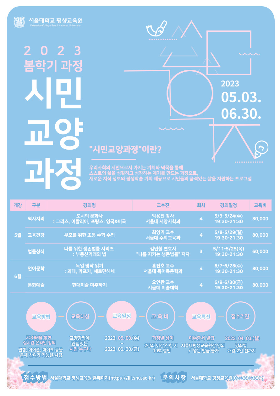 문화예술소식 평생교육원 | 서울대학교 평생교육원 2023년 봄학기 <시민교양과정> 안내