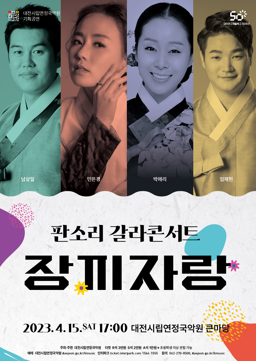 <공연안내> ○ 공 연 명 : 대전시립연정국악원 기획공연 [판소리 갈라콘서트 '장끼자랑'] ○ 공연일시 : 2023.04.15.(토) 17:00 ○ 공연장소 : 대전시립연정국악원 큰마당 ○ 관람등급 : 8세 이상 ○ 티켓가격 : R석 3만원, S석 2만원, A석 1만원 ○ 예매문의 : 대전시립연정국악원(042-270-8500)