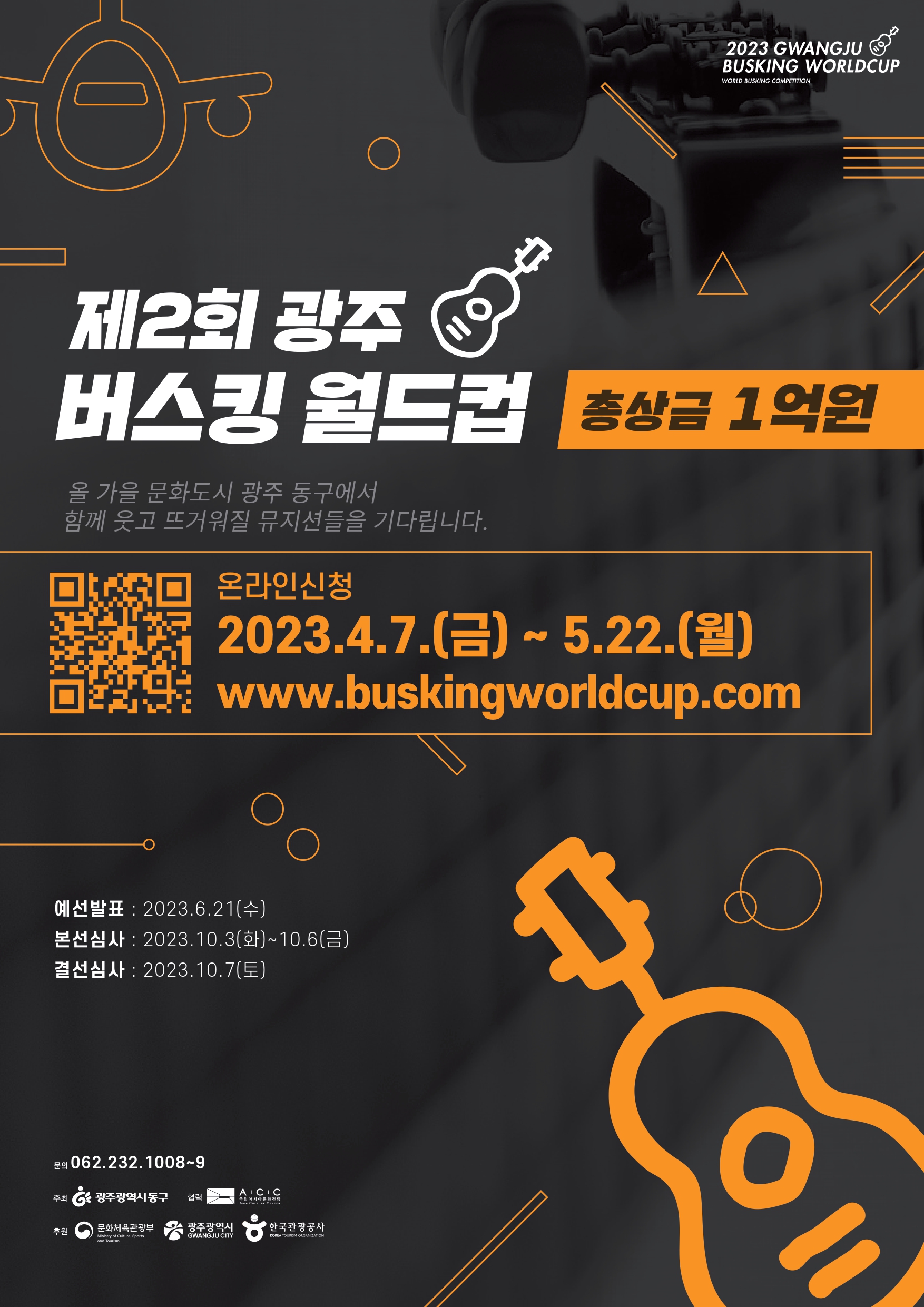 <안내> ○ 기 간 : 접수 (4.7. ~ 5.22.), 예선 (6.1. ~ 6.20.), 본선 (10.3. ~ 10.7.) * 일정은 상황에 따라 변경 가능함. ○ 장 소 : 광주 5·18민주광장, ACC하늘마당 등 광주 전역 ○ 참가대상 : 만 19세 이상 국내외 버스킹 뮤지션 ○ 시 상 금 : 총 9개 팀, 총상금 1억원 ○ 주최·주관 : 광주광역시동구 ○ 후 원 : 문화체육관광부, 광주광역시, 한국관광공사 ○ 신청방법 : 홈페이지 (www.buskingworldcup.com)