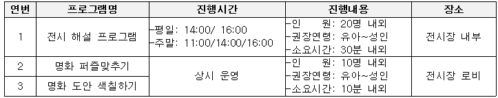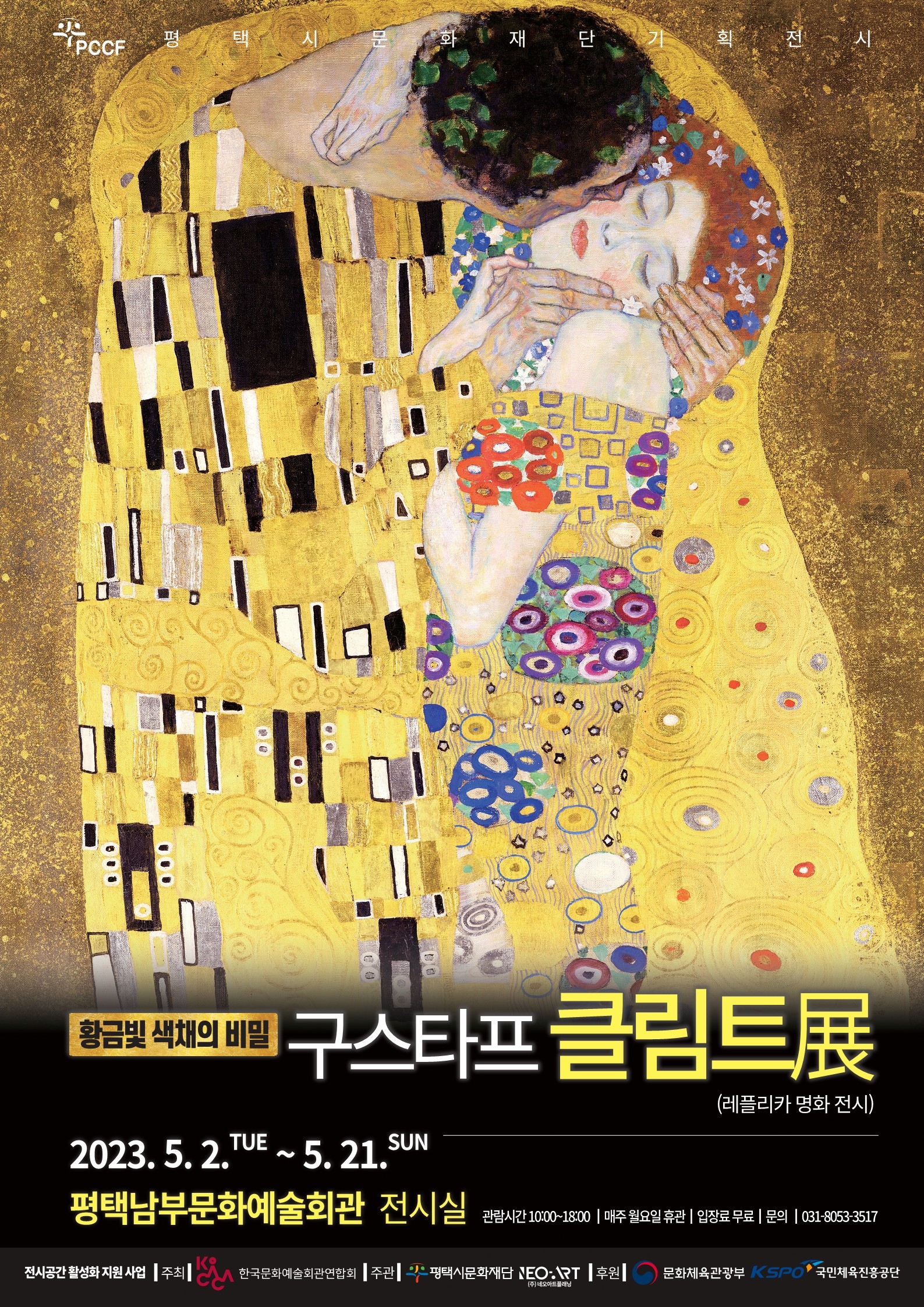 가. 전 시 명 : 2023년 평택시문화재단 기획전시 <황금빛 색채의 비밀 ? 구스타프 클림트展> 나. 전시기간 : 2023. 5. 2.(화) ~ 5. 21.(일), 10:00~18:00 ※ 월요일 휴관, 입장 마감 : 오후 5시 다. 전시장소 : 남부문화예술회관 전시실 라. 전시내용 : 작가의 생애별, 시기에 따른 작품 전시 및 체험 프로그램 마. 작 품 수 : 총 53점(회화 43점, 스케치 10점) 바. 프로그램 사. 단체예약 : 10인 이상 관람시 온라인 사전예약 필수(https://naver.me/GnC9C06P) 아. 문의사항 : 전시담당자 031-8053-3517
