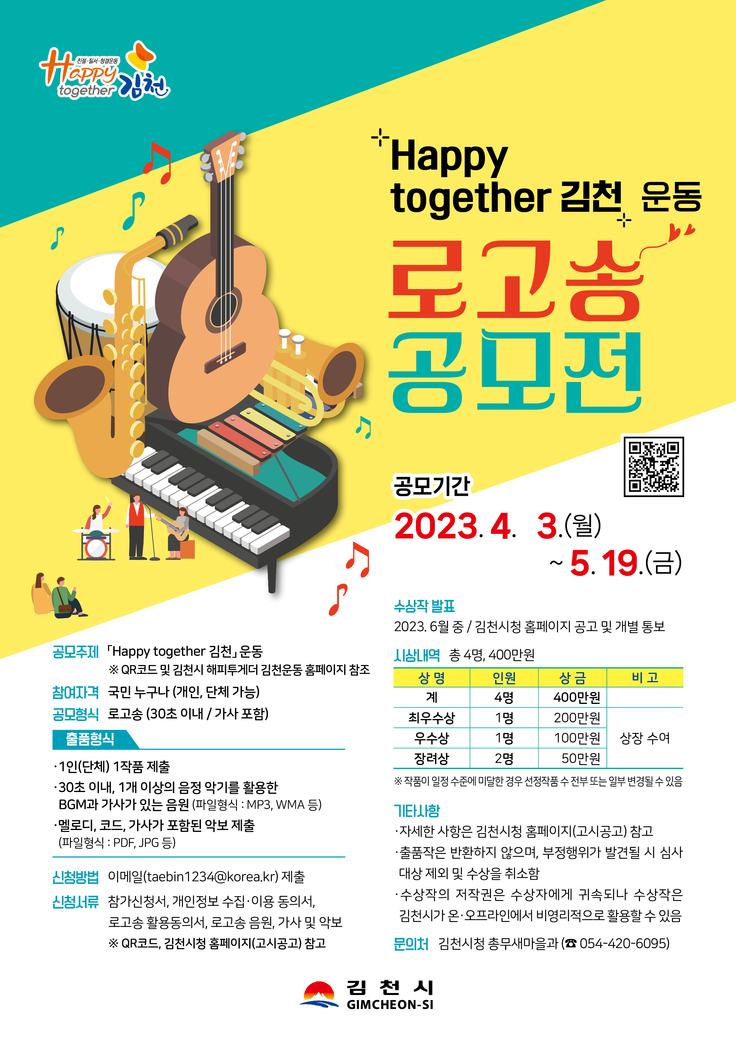 가. 공모기간 : 2023.04.03.(월) ~ 05.19.(금) 나. 참여자격 : 국민 누구나(개인/단체) 다. 공모주제 : 「Happy together 김천」운동 라. 공모형식 : 로고송(30초 이내 / 가사포함) 마. 신청방법 : 담당자 이메일(taebin1234@korea.kr) 제출 바. 결과발표 : 2023. 6월 중 / 김천시청 홈페이지 공고 및 개별 통보 예정 사. 문 의 : 김천시청 총무새마을과(☎054-420-6095)