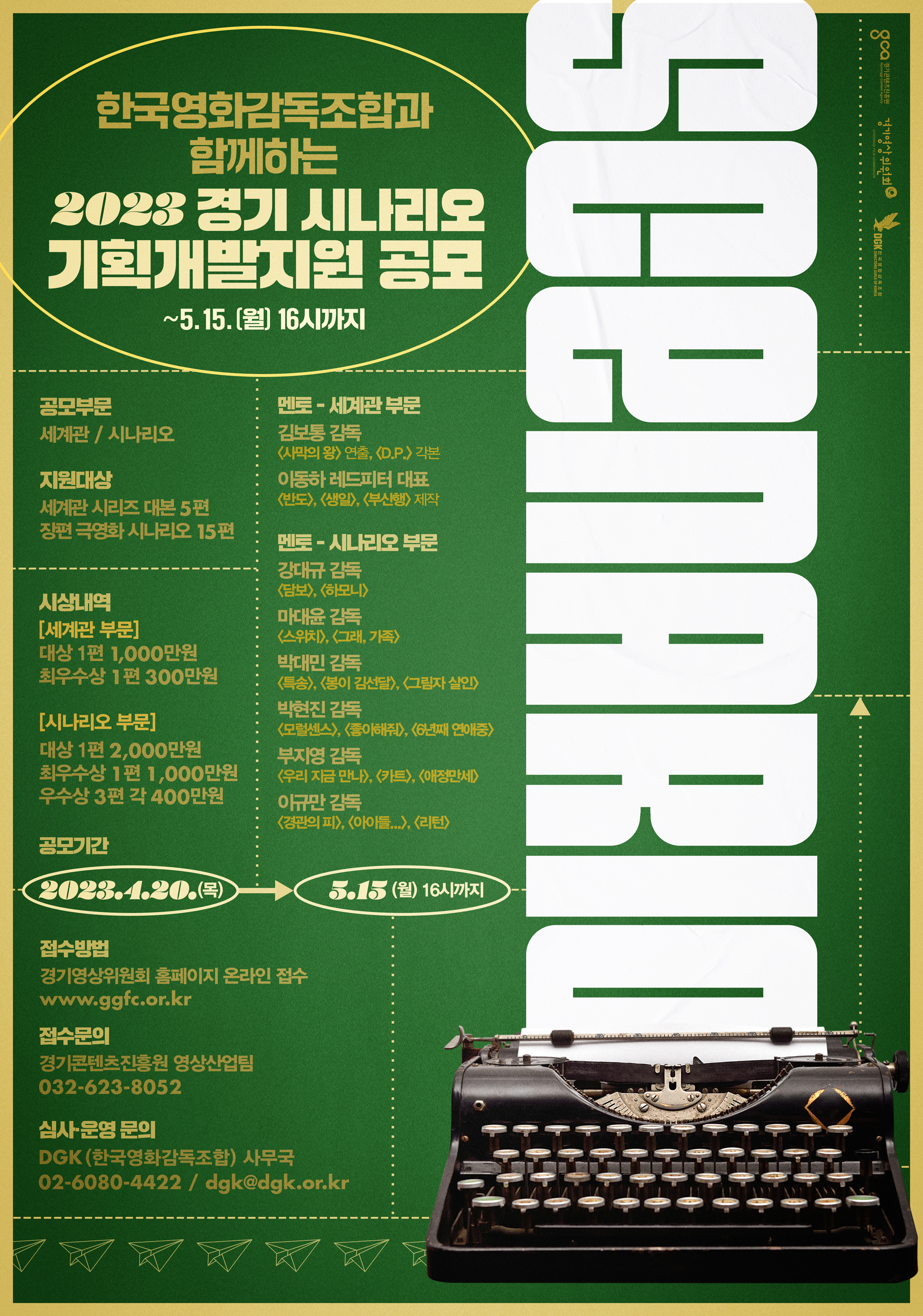 <공고안내> 가. 사 업 명 : 경기 시나리오 기획개발지원 나. 주 관 : 경기콘텐츠진흥원 다. 지원내용 : 세계관 시리즈·장편극영화 시나리오 개발지원 라. 신청자격 : 시나리오 작가(기성, 신인 무관) 마. 공모분야 : 세계관 부문, 시나리오 부문 바. 접수기간 : ~ 2023. 05. 15.(월) 16:00 까지 사. 접수방법 : 경기영상위원회 홈페이지 온라인 접수 - 양식다운로드 : www.gcon.or.kr(경기콘텐츠진흥원), www.ggfc.or.kr(경기영상위원회) 아. 협조사항 : 사업 포스터 및 공고문 홍보 자. 문의사항 : 경기콘텐츠진흥원 영상산업팀 032-623-8052 ※ 세부 내용은 경기영상위원회 홈페이지(www.ggfc.or.kr)로 방문 바랍니다.