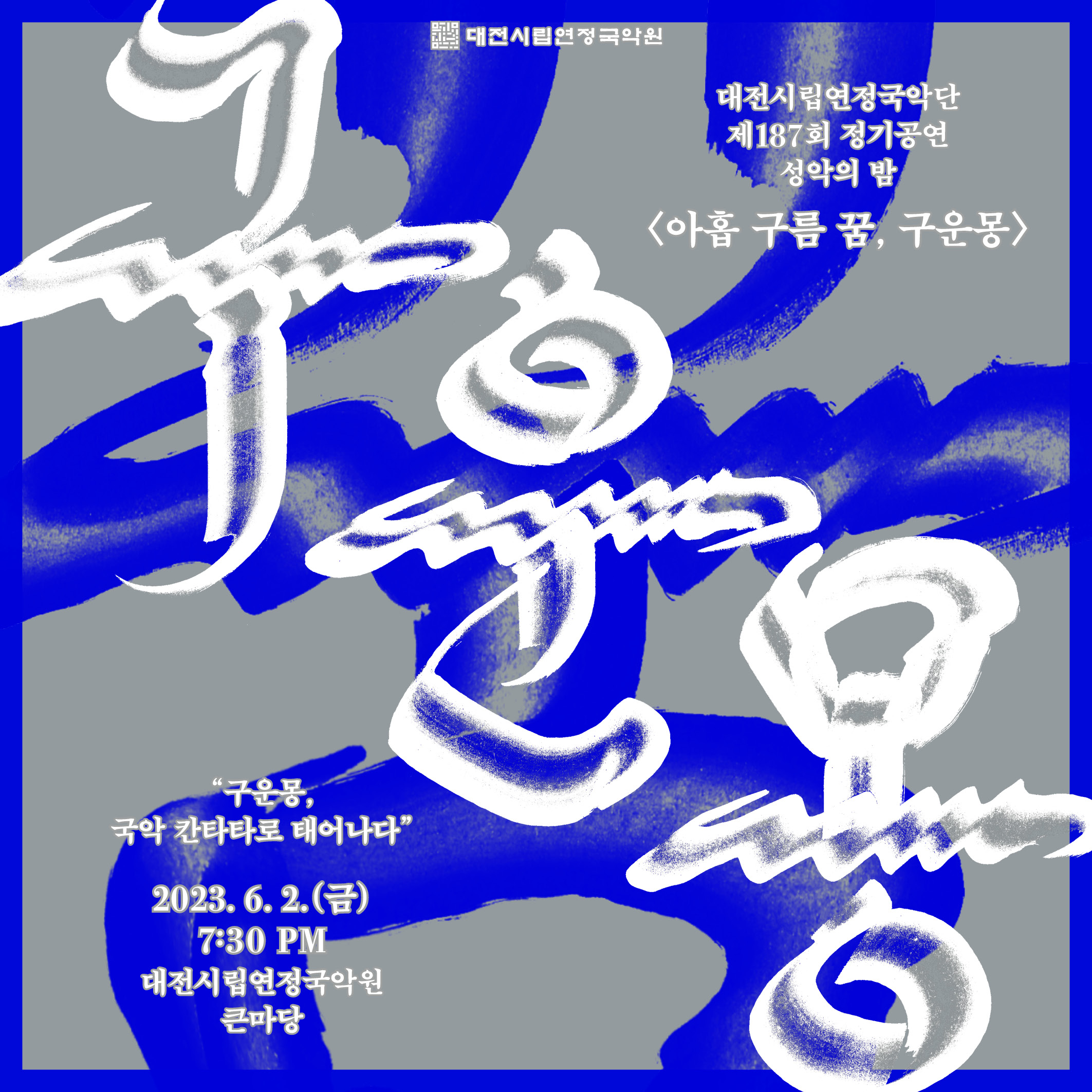 <공연개요> ■ 공 연 명 : 대전시립연정국악단 제187회 정기공연 [성악의 밤 - 아홉 구름 꿈, 구운몽] ■ 공연일시 : 2023.06.02.(금) 19:30 ■ 공연장소 : 대전시립연정국악원 큰마당 ■ 관람등급 : 8세 이상 ■ 티켓가격 : R석 3만원, S석 2만원, A석 1만원 ■ 공연문의 : 대전실립연정국악단 사무국(042-270-8585)