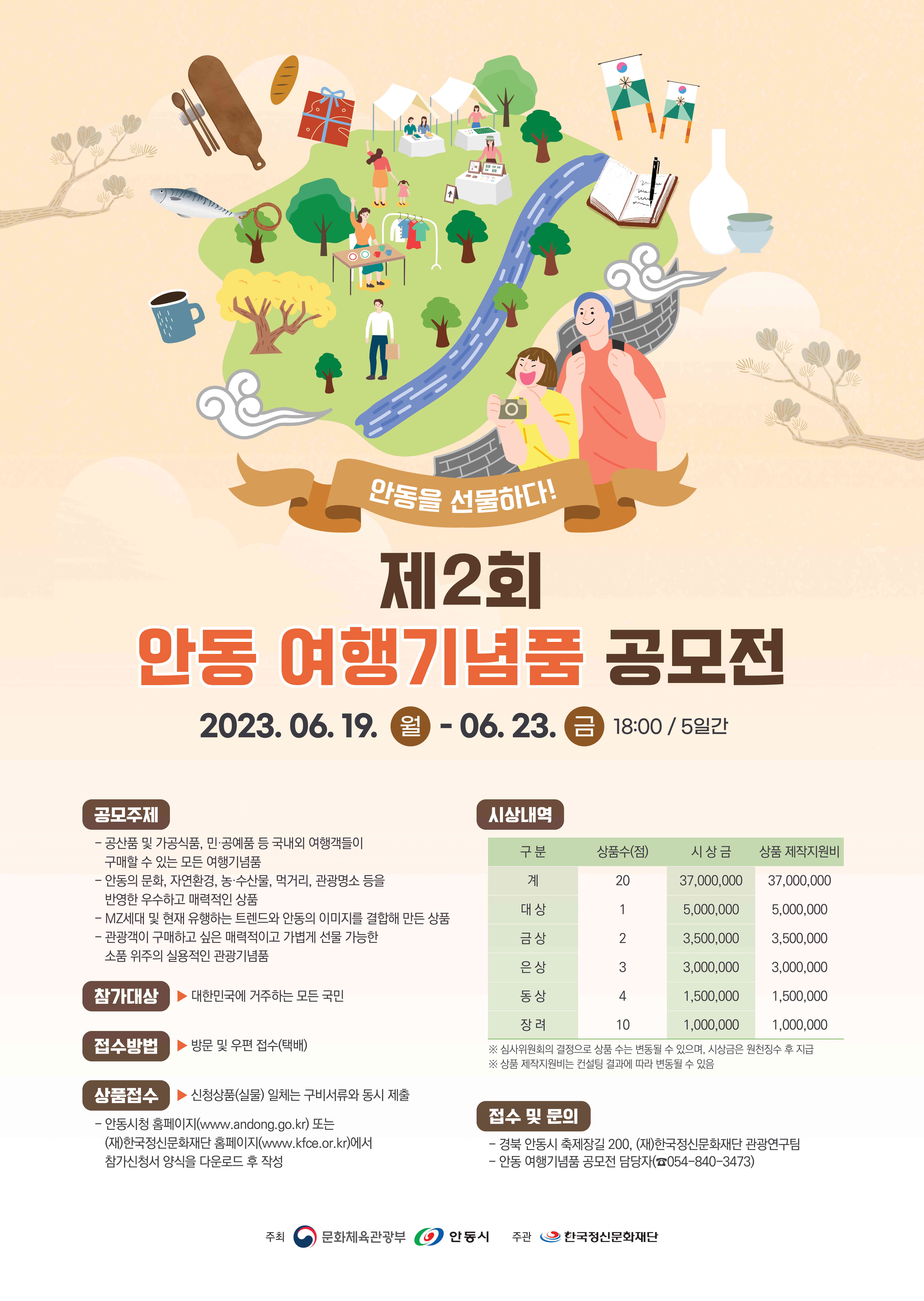 <공모안내> 가. 공 모 명 : ‘안동을 선물하다!’ 제2회 안동 여행기념품 공모전 나. 공모대상 : 대한민국에 거주지를 두고 있는 모든 국민 다. 공모부문 : 안동을 방문한 국내 ? 외 관광객이 구매할 수 있는 상징성과 상품성이 결합된 실용적인 관광기념품 라. 접수기간 : 2023. 6. 19. (월) ~ 6. 24. (금), 18:00까지 마. 접수방법 : (재)한국정신문화재단 홈페이지(https://www.kfce.or.kr/) 공지사항 참조