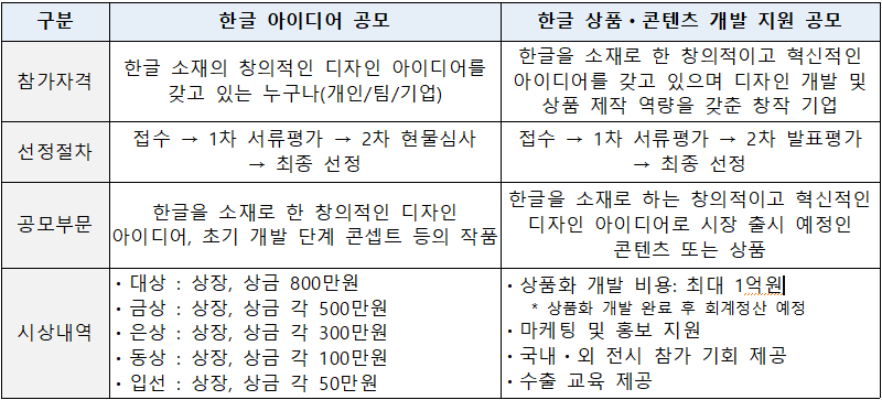 <공모전 안내> □ 공모전 개요 ㅇ 목적 : 한글 소재 아이디어의 상품화 연계를 통한 한글 소재 상품의 국내ㆍ외 상품화 성과 제고 ㅇ 주체기관 : (주최) 문화체육관광부, 국립한글박물관, (주관) 한국디자인진흥원 ㅇ 주요내용