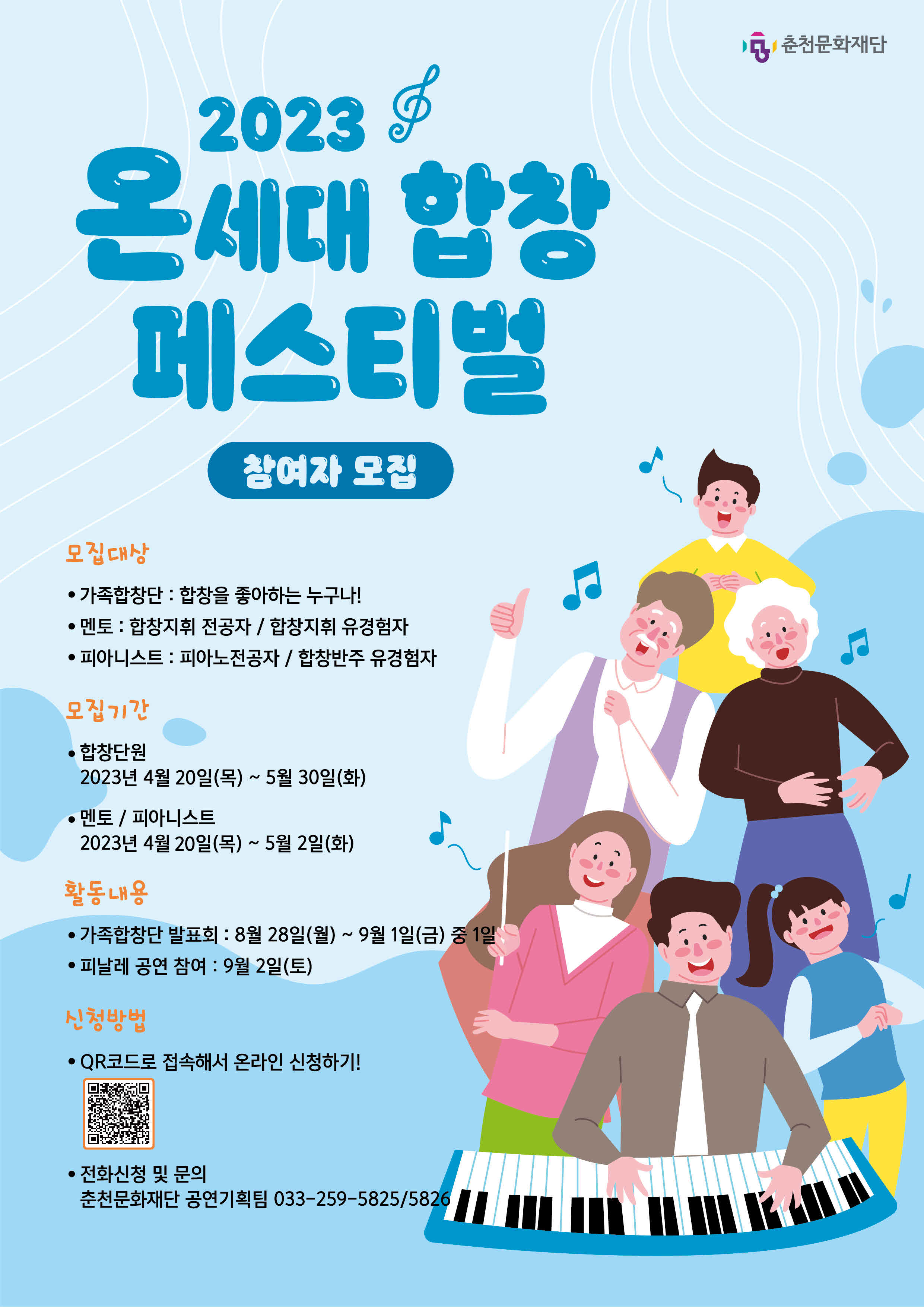 <행사개요> - 사 업 명 : 2023 온세대 합창페스티벌 - 모집기간 : 2023. 4.20(월) ~ 5.30(화) - 추진내용 : 합창과 노래를 좋아하는 2대 이상의 가족구성원, 학생합창단, 합창동호회 및 지역합창단 - 신청방법 : 홈페이지 (www.cccf.or.kr) 이메일 (pianoevelyn@cccf.or.kr) 전화등록 춘천문화재단 공연기획팀 033-259-5825/6 * 신청을 원하는 합창동호회 및 지역합창단은 첨부된 전환가족 합창단 명단리스트 작성 후 이메일로 송부