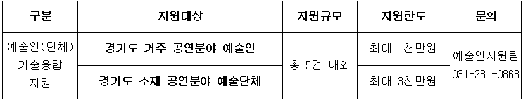 다. 사업안내 : 경기문화재단 홈페이지 참고(https://www.ggcf.kr/boards/businessNotices/articles/16778) 라. 신청방법 : 국가문화예술지원시스템(www.ncas.or.kr)을 통한 인터넷 신청 접수 마. 신청기간 : 2023년 5월 15일(월) ~ 5월 31일(수) 16:00 바. 관련문의 : 경기문화재단 예술인지원팀 (031-231-0868)
