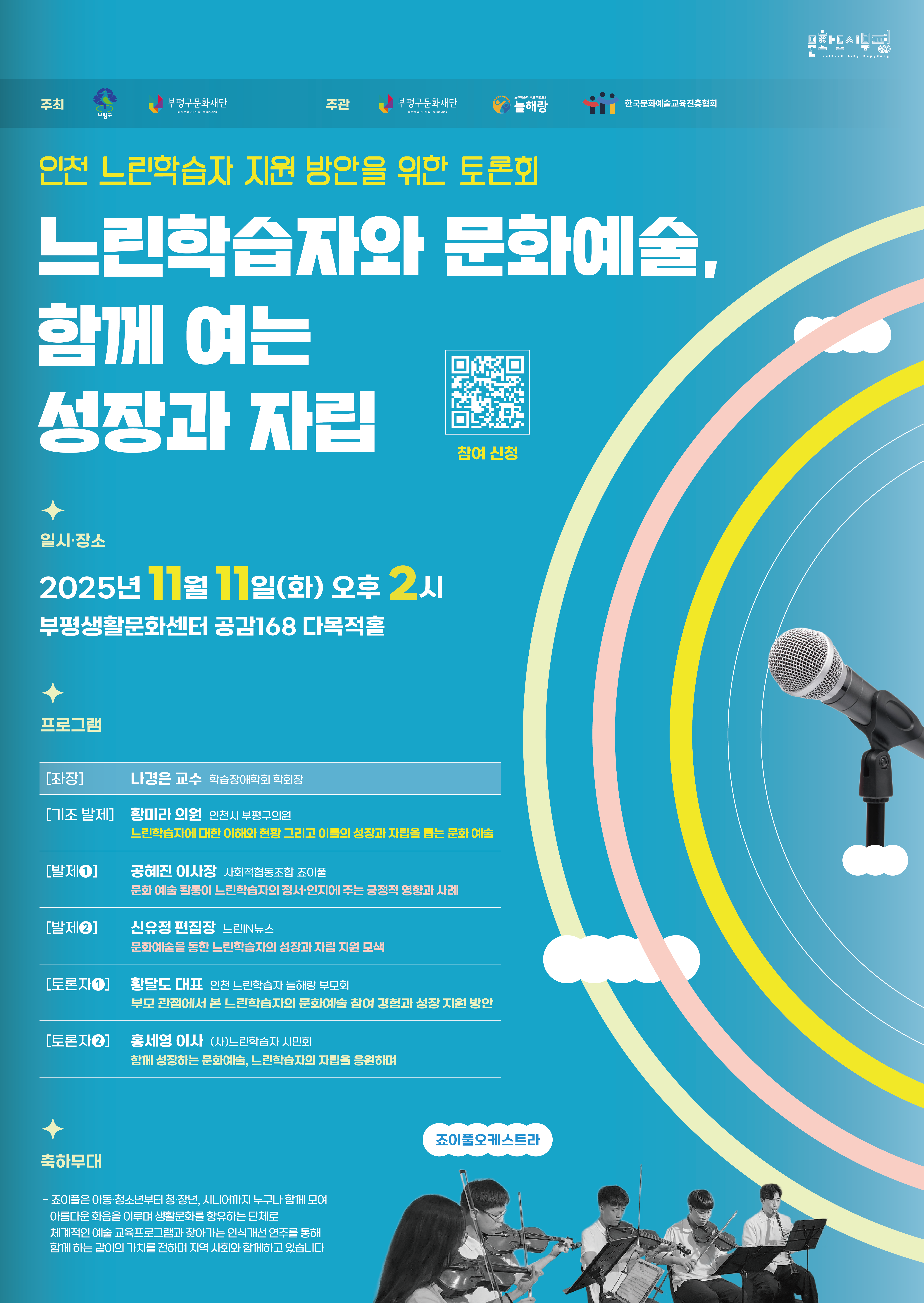 가. 행 사 명 : 2025 <인천 느린학습자 지원 방안을 위한 토론회 : 느린학습자와 문화예술, 함께 여는 성장과 자립> 나. 일 시 : 2025.11.11.(화) 14:00 ~ 16:00 다. 장 소 : 부평생활문화센터 공감168 1층 다목적홀 (인천 부평구 아트센터로 168) 라. 대 상 : 느린학습자 학부모, 교육기관 종사자, 문화예술·복지 기관 관계자 등 마. 참여방법 : 사전 참가신청 접수 ☞ https://naver.me/G1maFDY8 바. 관련문의 : 부평구문화재단 문화도시센터 시민창조팀 (032-500-2166)