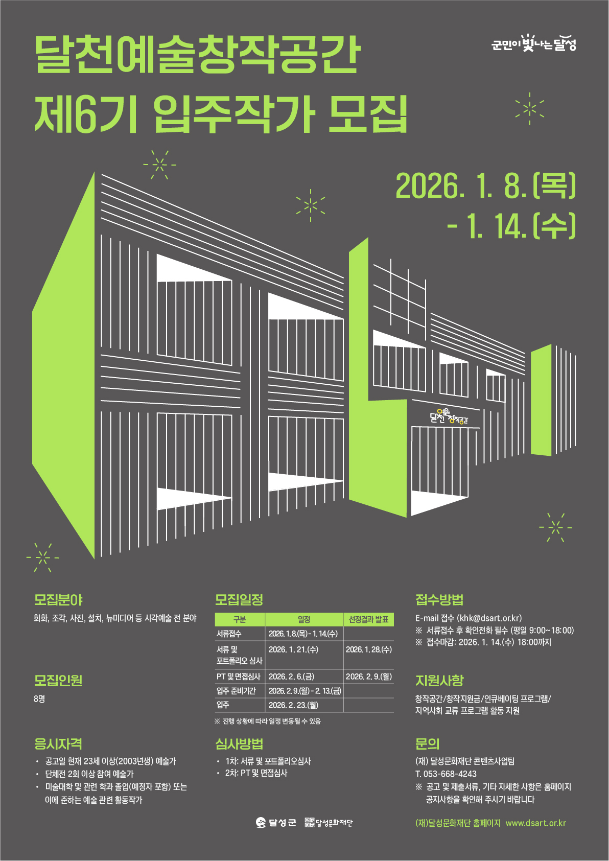 가. 모 집 명: <달천예술창작공간 제6기 입주작가 모집> 나. 공고기간: 2026. 1. 5.(월)~1.14.(수) 다. 접수기간: 2026. 1. 8.(목)~1.14.(수) 18:00 까지 라. 모집인원: 총 8명(회화, 조각, 사진, 설치, 뉴미디어 등 시각예술 전 분야) 마. 접수방법: 이메일 접수(khk@dsart.or.kr) - 문의: 달성문화재단 콘텐츠사업팀(053-668-4243)