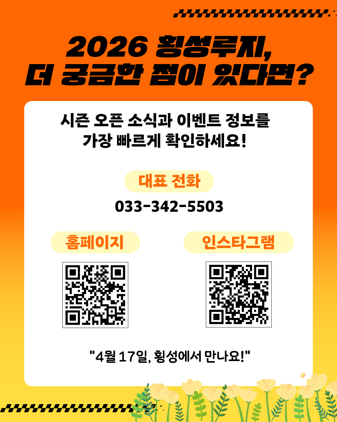 가. 시 설 명 : 횡성 루지체험장 나. 주요내용 : 단일 코스 세계 최장(2.4km) 루지 체험 및 부대시설 운영 다. 개 장 일 : 2026. 04. 17 (금) 라. 이용안내 : 횡성문화관광재단 홈페이지(https://luge.hsg.go.kr/kor/main/) 참조 마. 요청사항 : 2026시즌 횡성 루지체험장 개장 온·오프라인 홍보(홈페이지 및 SNS 게시 등) 바. 문의사항 : (재)횡성문화관광재단 시설운영팀(T.033-808-8227)