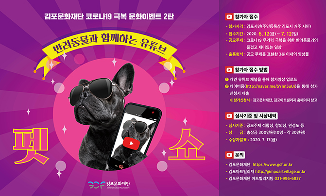 - 김포아트빌리지 반려동물과 함께하는 유튜브 ‘펫쇼’ 개최- ![]() (재)김포문화재단(대표이사 최해왕)은 오는 6월 12일(금)부터 코로나19 우울증 극복을 위한 문화이벤트인 <김포아트빌리지 반려동물과 함께하는 유튜브 ‘펫쇼’>(이하 ‘펫쇼’)를 개최한다. 이번 행사는 많은 시민들의 참여 속에 마무리 된 ‘김포시민 유튜브 안방 복면가요제’에 이어 두 번째로 개최하는 온라인 행사로서, 장기화되는 코로나19로 인해 지친 시민들의 몸과 마음을 반려동물과 함께 즐거운 시간을 보내며 이겨낼 수 있도록 준비한 행사이다.