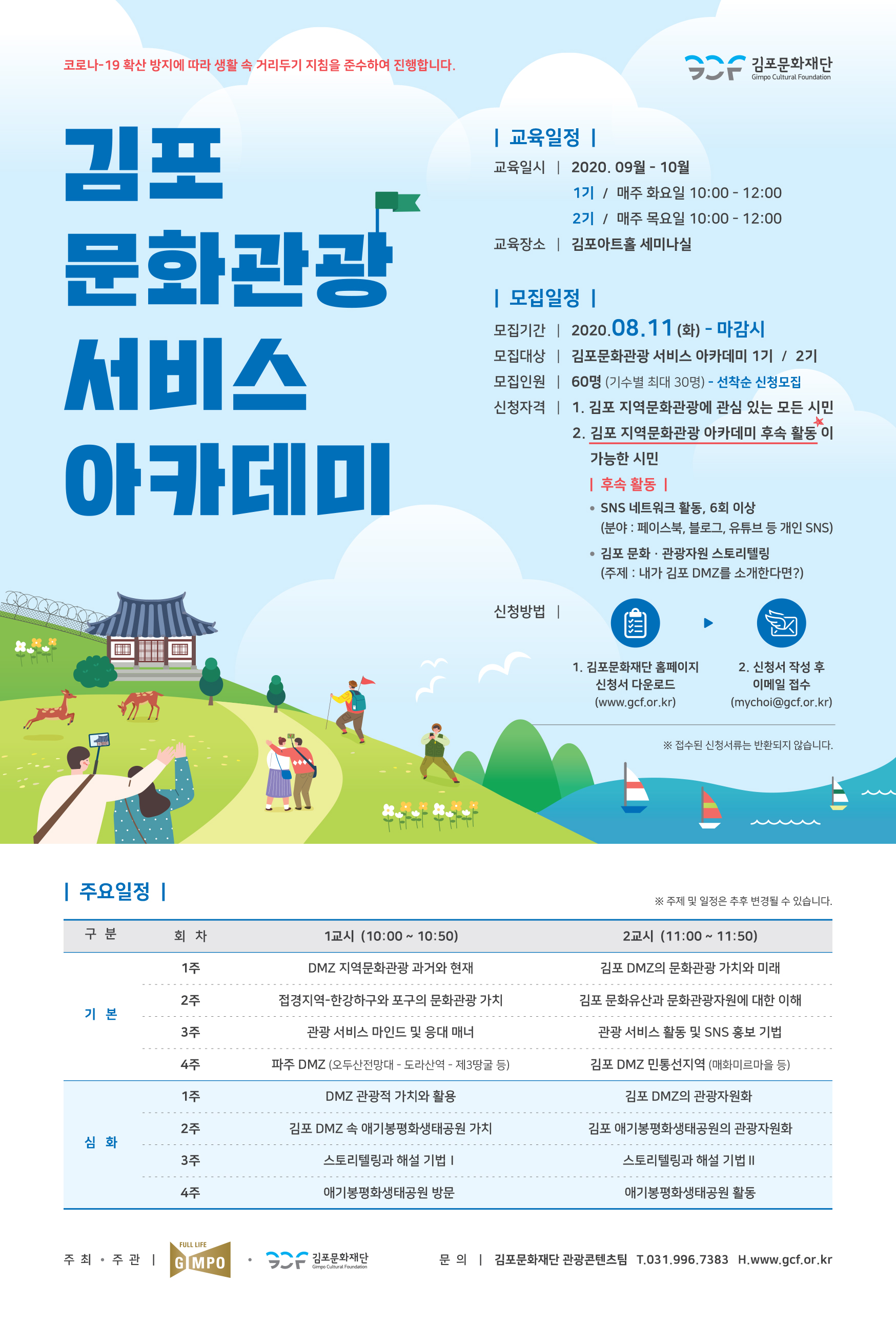 - 지역 역량 강화교육부터 후속 활동까지, 김포의 문화관광을 위하여! - ![]() (재)김포문화재단(대표이사 최해왕)은 DMZ지역으로서 김포 문화관광 선진화를 위해 시민 대상으로 「김포문화관광 서비스 아카데미」(이하‘아카데미’)를 개최한다. 오는 9월부터 10월까지 총 2개월간 운영되는 이번 아카데미는 김포DMZ의 가치, 문화관광자원의 이해, 관광 서비스 및 홍보, 스토리텔링과 해설 등 김포문화관광과 관련한 전반적인 교육으로 1기와 2기 두 차례에 걸쳐 진행된다. 1기와 2기 각 참여자는 아카데미와 함께 지역 문화관광을 홍보하는 후속 활동(SNS 네트워크, DMZ 스토리텔링)을 병행하여 서비스 함양의 시간도 갖는다. 김포문화관광에 관심이 있는 모든 시민이라면 누구나 김포문화재단 홈페이지를 통해 신청 가능하며, 문의사항은 김포문화재단 관광콘텐츠팀(031-996-7383)으로 하면 된다. (재)김포문화재단 최해왕 대표이사는 “이번 아카데미를 통해 김포DMZ 지역관광 에 대한 인식 개선과 선진화를 이루는 시간이 될 것”이라고 전하며, “시민과 함께하는 관광생태계를 마련하고 지역관광 네트워크의 장이 되기를 바란다.”라고 덧붙였다. 한편, 최근 수도권 코로나-19의 확산으로 사회적 거리두기가 강화되고 있는 만큼 아카데미 운영 시 집합 인원 제한, 마스크 착용, 사업장 방역 및 소독에 만전을 기하고 정부의 방역수칙을 철저히 준수하여 진행될 예정이다. |