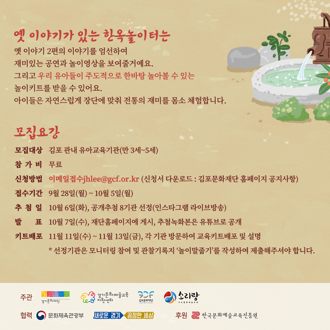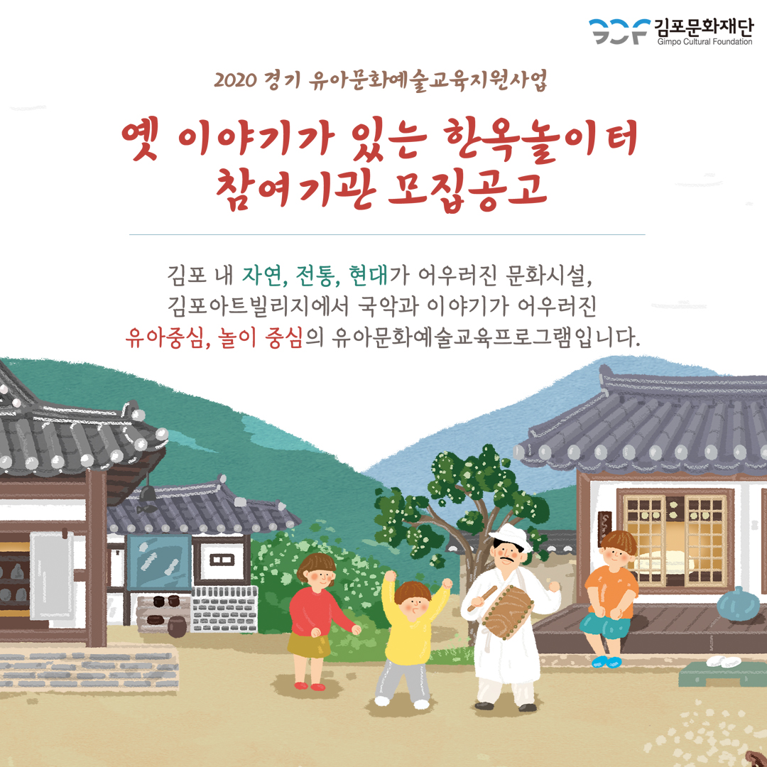 -‘옛 이야기가 있는 한옥놀이터’ 참여기관 모집- ![]() ![]() (재)김포문화재단(대표이사 안상용)은 국악기반 유아문화예술교육프로그램 ‘옛 이야기가 있는 한옥놀이터’의 참여 유아교육기관을 오는 9월 28일부터 10월 5일까지 모집한다고 밝혔다. 문화체육관광부와 경기도가 후원하고 김포문화재단과 소리랑, 경기문화재단, 경기문화예술교육지원센터가 공동주관하는 ‘옛 이야기가 있는 한옥놀이터’는 경기 유아문화예술교육 지원 사업으로 올해 2년 연속 선정된 사업이다. 개정된 누리과정을 반영하여 유아중심, 놀이중심의 국악기반 통합문화예술교육프로그램이며 아트빌리지 한옥마을을 무대로 운영할 예정이었으나, 코로나19 사태에 따라 비대면교육으로 진행한다. ‘옛 이야기가 있는 한옥놀이터’에서는 옛 이야기 2편을 주제로 공연영상, 놀이영상, 교보재로 구성된 교육키트를 배포할 예정이며, 예술강사가 직접 방문하여 배포하고 일대일 면담을 통해 자세한 설명회를 가질 예정이다. 옛 이야기 ‘개와 고양이’와 ‘방귀아씨 시집간다’에 우리전통 국악기로 연주하는 창작동요가 어우러진 ‘옛 이야기가 있는 한옥놀이터’는 전통놀이를 착안하여 만든 놀이교재로 유아들에게 다양한 움직임과 협동심을 발현시키고 전통의 가치를 심어줄 것으로 기대된다. 안상용 김포문화재단 대표이사는 “이번 유아문화예술교육사업을 통해 유아들의 타고난 선천적인 예술가적 기질을 밖으로 표출할 수 있는 기회를 만들고 국악이라는 전통문화예술을 접할 수 있는 좋은 계기가 될 것”이라고 전했다. 본 사업은 김포 관내 어린이집, 유치원이라면 신청 가능하며 신청방법과 세부내용은 김포문화재단 홈페이지(www.gcf.or.kr)에서 확인 가능하다. |
