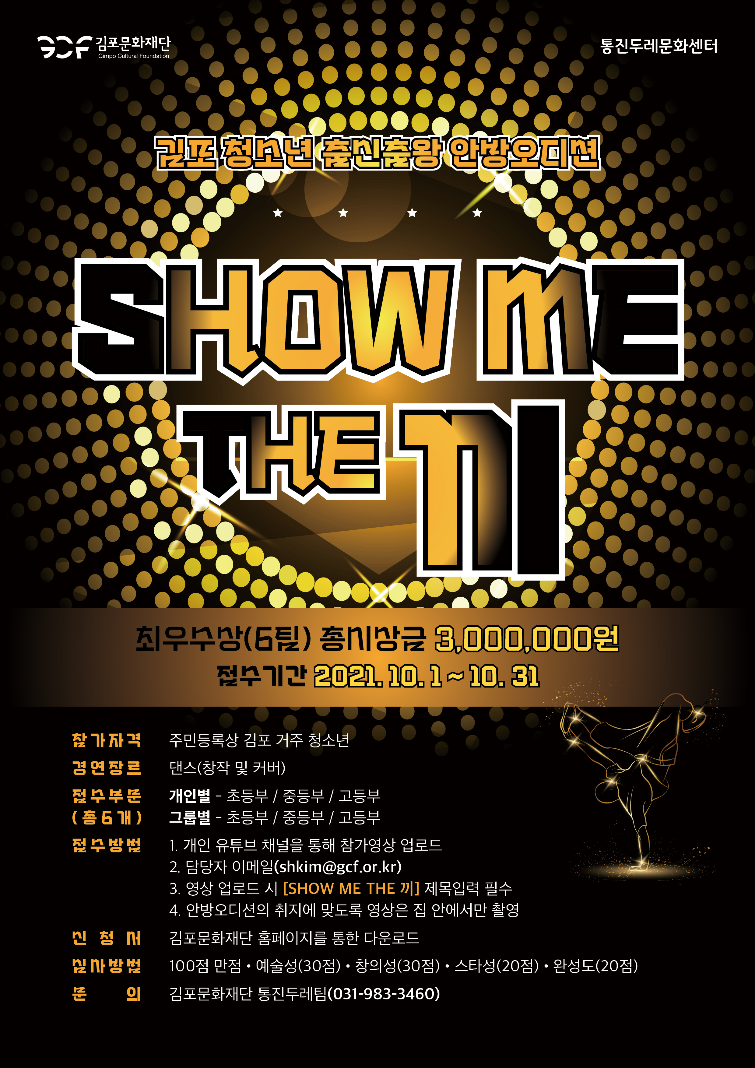 ![]() | <김포문화재단, 춤신춤왕 안방오디션 『SHOW ME THE 끼!』> 개최 (재)김포문화재단은 10월 1일부터 10월 31일까지 한 달간 청소년 춤신춤왕 댄스오디션 『SHOW ME THE 끼!』를 개최한다. 이번 댄스오디션은 장기간 지속된 사회적 거리두기로 문화향유 기회가 줄어든 관내 초등학생과 청소년들이 온라인 오디션을 통해 예술적인 재능을 표현하고, 색다른 추억을 만들어 볼 수 있도록 기획되었다. 안방오디션 『SHOW ME THE 끼!』 참가자격은 주민등록상 김포시 거주 시민으로, 개인 또는 그룹 단위로 집안에서 영상을 촬영하여 개인 유튜브 채널을 통해 참가할 수 있으며, 영상 업로드와 함께 참가신청서를 반드시 제출해야 한다. 참가자 영상은 전문 심사위원의 심사를 거쳐 총 6팀에게 팀별 50만원 상당의 교육 문화상품권을 시상할 계획이며, 수상자에게는 향후 통진두레문화센터 공연 참여 기회도 주어질 예정이다. 김포문화재단 이민수 팀장은, “이번 행사는 코로나19로 장기간 집콕 생활을 이어오고 있는 관내 초·중·고등학교 학생들을 위한 온택트 이벤트로 준비하였다.”라고 말하며 “이번 댄스오디션을 통하여 청소년들이 자신들의 재능을 마음껏 펼칠 수 있는 기회가 되기를 바란다”고 말했다. 청소년 춤신춤왕 안방오디션 『SHOW ME THE 끼!』는 오는 10월 31일까지 접수 가능하며, 관련 문의는 김포문화재단 통진두레팀(031-983-3460)으로 하면 된다. |