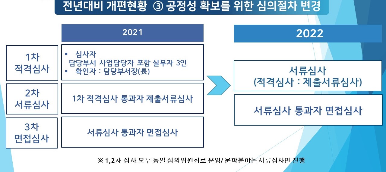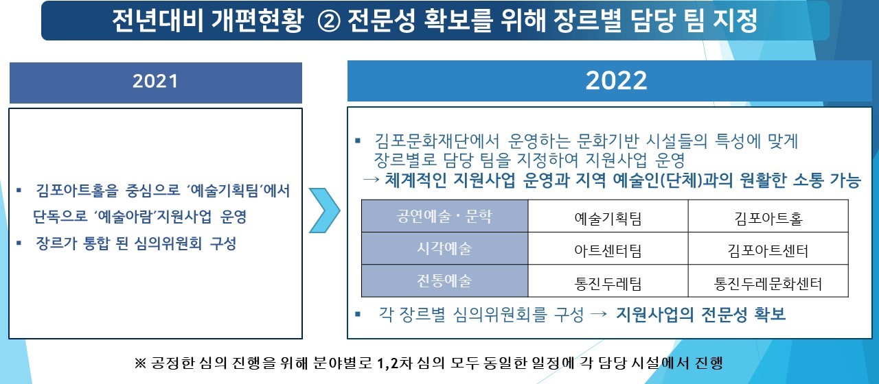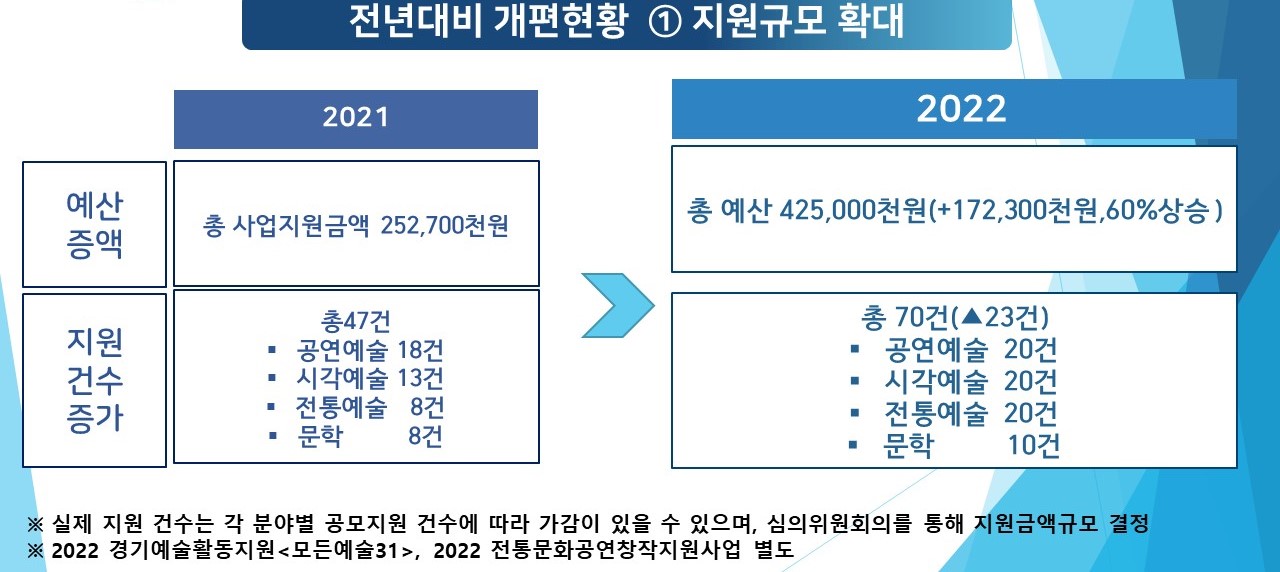 ![]() 사진자료 1. <2022 김포예술활동지원 사업 공모 접수> 이미지 포스터 | 김포문화재단, 2022 김포예술활동지원 사업 공모 접수 (재)김포문화재단은 김포 지역예술인∙예술단체의 예술활동을 지원하는 <2022 김포예술활동지원사업>을 시행한다. 지원분야는 전문예술, 생활문화예술, 문학으로 나눠지며, 전문예술 및 생활문화예술은 다시 세분화하여 공연예술, 시각예술, 전통예술로 구분된다. 각 장르별 지원한도는 전문예술의 경우 최대 1천만원, 생활문화예술과 문학은 최대 4백만원을 지원한다. 공고일 기준 김포 관내 거주(소재)중인 전문예술인(단체) 또는 생활문화예술동호인(단체)과 지원 전형별 별도 신청자격을 충족하면 지원할 수 있고, 전문예술에 지원하고자 하는 예술인(단체 포함)은 최근 5년 이내 2회 이상 김포시에서 시행된 예술 활동 실적을 제출하면 된다. 아울러 사업에 공모신청을 하는 개인 및 단체는 대표자의 예술인활동증명서를 제출해야 한다. 비영리 단체인 경우는 3년 이상 활동증명이 필요하다. 또한 생활문화예술의 경우 공고일 기준 김포 거주1년 이상 생활문화예술인 및 단체(대표자기준)여야 하며, 단체는 최소 5인 이상 구성되어야 한다. 특히 이번 지원사업은 지난해 논란이 되었던 예술아람사업을 전면 개편하여 추진하는 예술인지원정책으로 지역의 보다 많은 예술인 지원을 위해 작년대비 사업비 총 예산이 60%증액 되었으며, 지원건수 또한 증가할 예정이다. 또한 지원사업의 전문성 확보를 위해 지원분야를 담당하는 팀에서 사업을 추진하며, 체계적인 운영과 지역 예술인과의 원활한 소통이 이뤄질 수 있도록 하였다. 그리고 공정성 확보를 위해 기존 ‘적격심사 – 서류심사 - 면접심사’ 방식을 개편하여 적격심사를 없애고, 외부 전문가 심의위원이 서류심사와 면접심사를 100%진행한다. 이와 함께 재단관계자는 '지역예술인을 위해 김포예술인DB사업으로 별도의 증명을 간소화하는 방안과 예술인지원센터의 구축으로 예술인의 활동과 커뮤니티 활동증진, 아카데미 사업, 지자체 간 협력, 교류사업, 예술인축제사업 등의 추진을 위해 연구 ‧검토하고 있다.' 고 하였다. 지원신청은 3월 25일(금) 18시까지 김포문화재단 홈페이지에서 지원서 양식을 다운받아 작성 후 각 분야 담당부서 이메일 및 방문접수로 제출하면 된다. 공모에 관한 자세한 사항은 김포문화재단 홈페이지(www.gcf.or.kr)에서 확인 가능하다. 문의 ▲ 공연예술 ‧ 문학 031.996.1604(예술기획팀) ▲ 시각예술 031.996.7484(아트센터팀) ▲전통예술 031.983.3460(통진두레팀) ![]() 사진자료 2. 전년대비 개편현황 (1) ![]() 사진자료 3. 전년대비 개편현황 (2) ![]() |