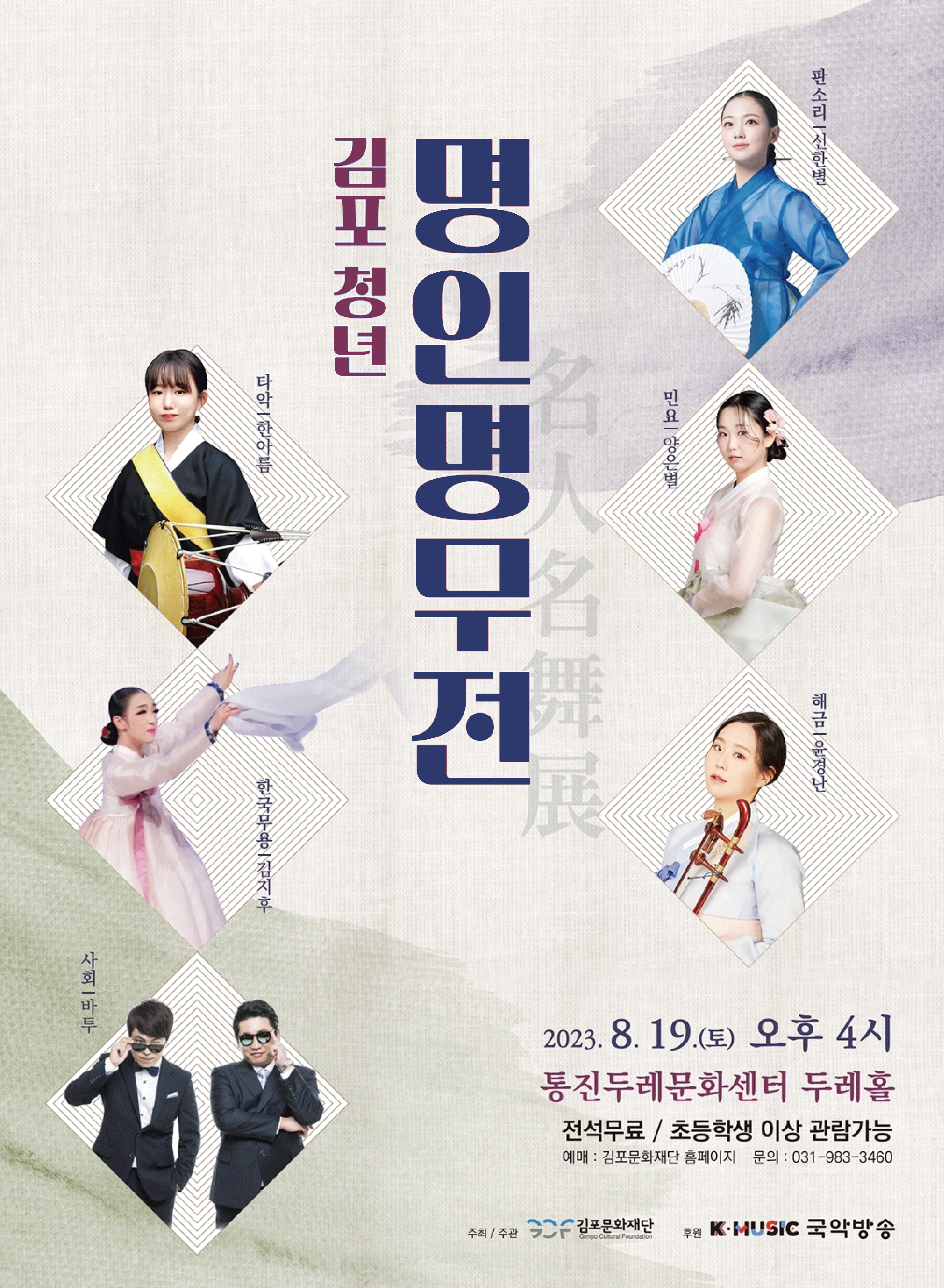 (재)김포문화재단은 오는 8월 19일(토) 오후 4시 통진두레문화센터 두레홀에서 김포 청년 국악의 진가를 보여줄 <김포 청년 명인명무전>를 무료로 개최한다.