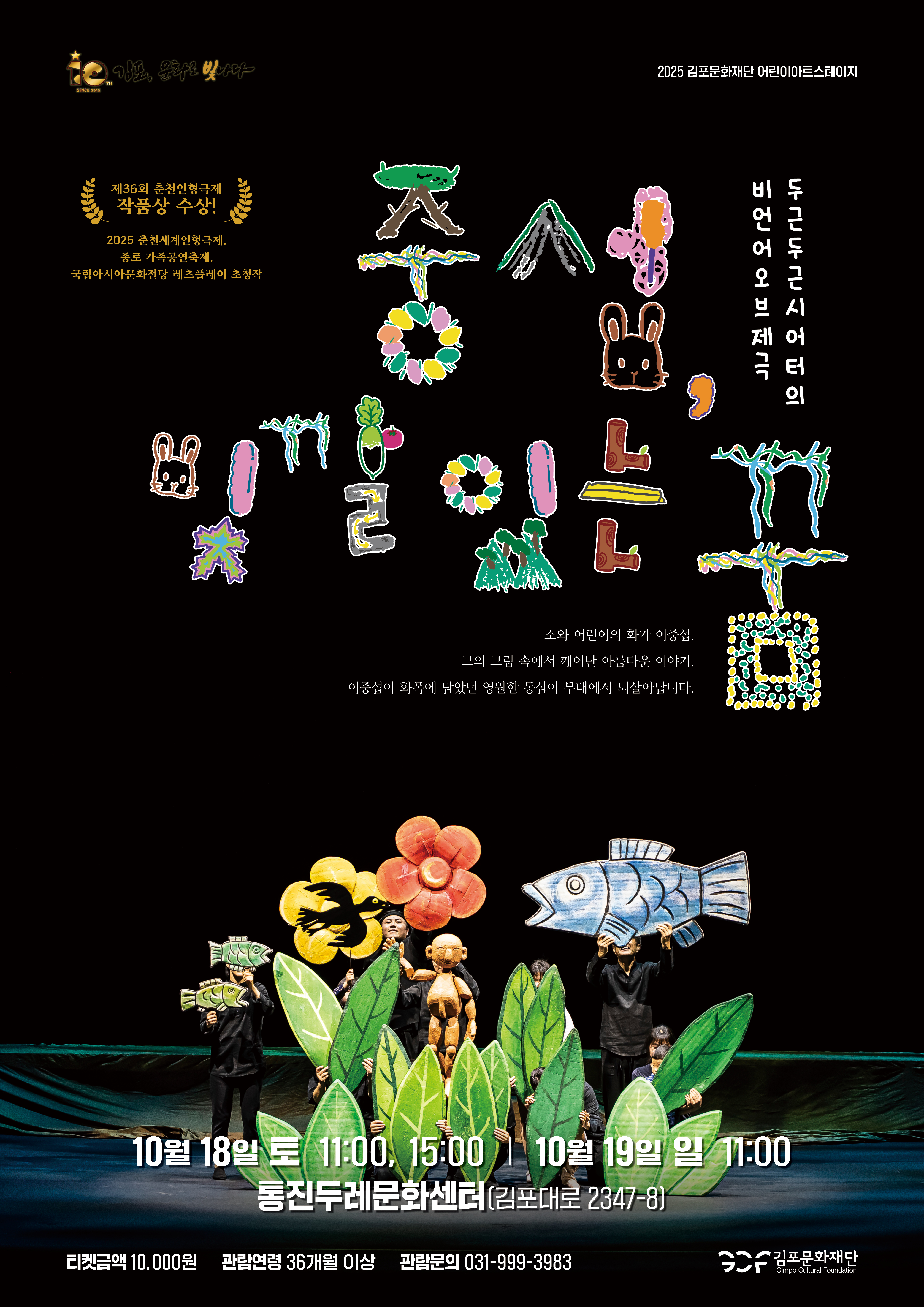 (재)김포문화재단(대표이사 이계현)은 10월 18일부터 19일까지 통진두레문화센터 두레홀에서‘2025 통진두레문화센터 어린이 아트스테이지’의 세 번째 공연 작품인 <중섭, 빛깔 있는 꿈>을 선보인다. <중섭, 빛깔 있는 꿈>은 한국 근대미술의 거장 이중섭의 삶과 예술 세계를 어린이의 눈높이에 맞춰 풀어낸 창작극이다. 전쟁 피난 시절 제주에서 보낸 화가 이중섭의 시간을 바탕으로, 그의 작품에 담긴 가족에 대한 사랑, 아이들에 대한 애정, 자연과 생명에 대한 감수성을 비언어적 무대 언어로 표현한다. 특히 이중섭의 작품 속에 자주 등장하는 물고기, 게, 아이의 모습 등이 무대 위에서 오브제와 영상으로 구현되어 그림이 살아 움직이는 듯한 색다른 경험을 제공할 예정이다. 공연은 10월 18일(토) 오전 11시, 오후 3시와 10월 19일(일) 오전 11시 총 3회 진행된다. 36개월 이상 관람이 가능하며 전석 1만원이다. 티켓예매는 김포문화재단 누리집(www.gcf.or.kr)에서 가능하다. 한편, ‘2025 통진두레문화센터 어린이 아트스테이지’ 공연은 국립아시아문화전당재단과 종로문화재단과의 협업으로 공모를 통해 총 5편을 선정했으며, 지난 6월 음악인형극 <별길 따라 별별 이야기>를 시작으로 8월은 어린이 무용극 <남극에서 살아남기>를 공연을 진행했다. 오는 11월에는 제주설화를 국악으로 풀어낸 전통음악극 <청비와 쓰담 특공대>, 소리, 춤, 연희를 기반으로 한 판소리 음악극 <셋!>을 선보일 예정이다. 공연문의 (031)999-3983 |