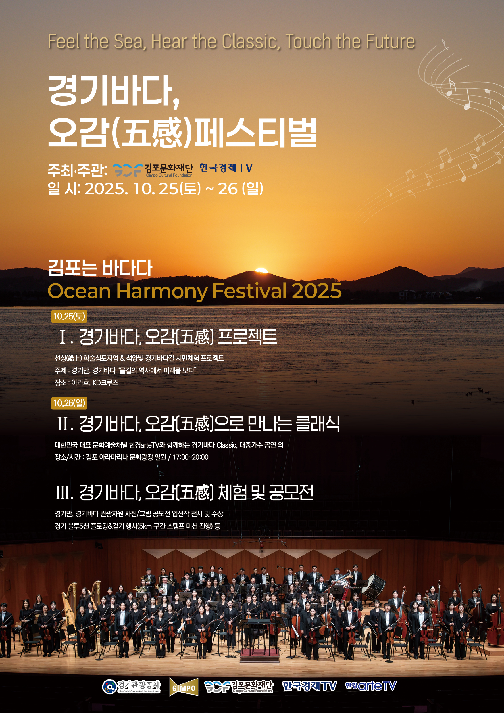 (재)김포문화재단(대표이사 이계현)은 오는 10월 25일(토)부터 26일(일)까지 양일간 김포 아라마리나 문화광장에서 「Ocean Harmony Festival 2025, 경기바다 오감(五感) 페스티벌」을 개최한다고 밝혔다. 이번 행사는 한국경제TV 및 한경arteTV가 주관하고 경기관광공사가 후원한다. 이번 페스티벌은 ‘Feel the Sea, Hear the Classic, Touch the Future’를 슬로건으로, 김포를 서해의 대표 해양관문도시로 알리고 경기바다 브랜드 가치를 높이는 데 목적을 두고 있다. 특히 25일에는 ▲시민이 참여하는 ‘김포바다 새 물길 개척 프로젝트’ ▲‘경기만, 경기바다 물길의 역사에서 미래를 보다’를 주제로 한 선상 학술세미나 ▲선상 투어 및 선상 클래식 콘서트가 진행된다. 이는 대명항의 역사적 가치를 재조명하고, “김포는 바다다”라는 인식을 확산시키는 의미 있는 프로젝트이다. 26일에는 ▲바다 사진/그림 공모전 수상작 전시 ▲플로깅&체험 프로그램 ▲푸드트럭 등 다채로운 부대행사가 시민과 관광객을 맞이한다. 저녁에는 경기바다의 아름다운 풍경을 영상으로 담아내는 미디어 아트와 오케스트라가 함께하는 클래식 공연이 마련돼, 해양과 문화예술을 융합한 고품격 문화축제로서의 정체성을 확립할 예정이다. (재)김포문화재단 이계현 대표이사는 “김포는 경기 서해권의 중요한 해양 거점도시”며 “이번 행사가 김포바다의 역사·문화적 가치를 널리 알리고, 다양한 세대가 즐길 수 있는 해양문화축제로 자리매김하길 기대한다”고 말했다. 이번 페스티벌은 시민 참여와 함께 만들어가는 축제라는 점에서 의미가 크다. 선상 학술세미나, 시민참여 물길개척 프로젝트, 사진·그림 공모전 등 주요 프로그램은 추후 공고가 이뤄질 예정이다. 자세한 정보는 김포문화재단누리집(www.gcf.or.kr)을 통해 확인할 수 있다.